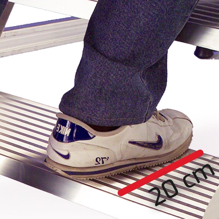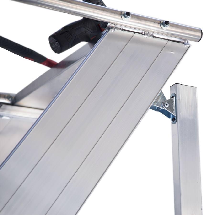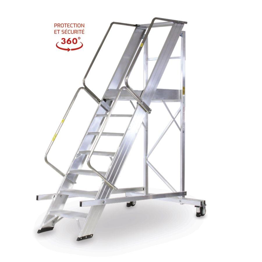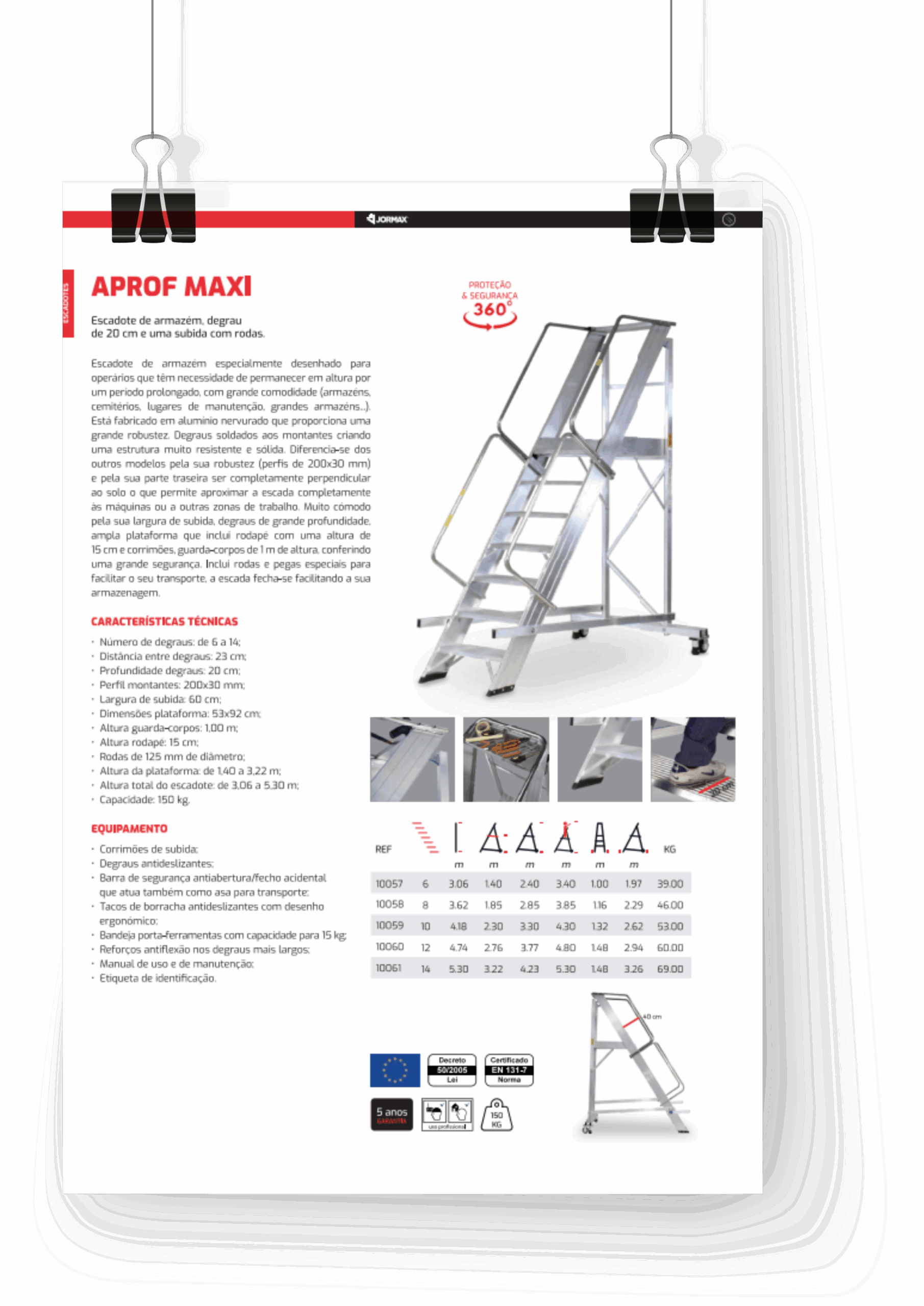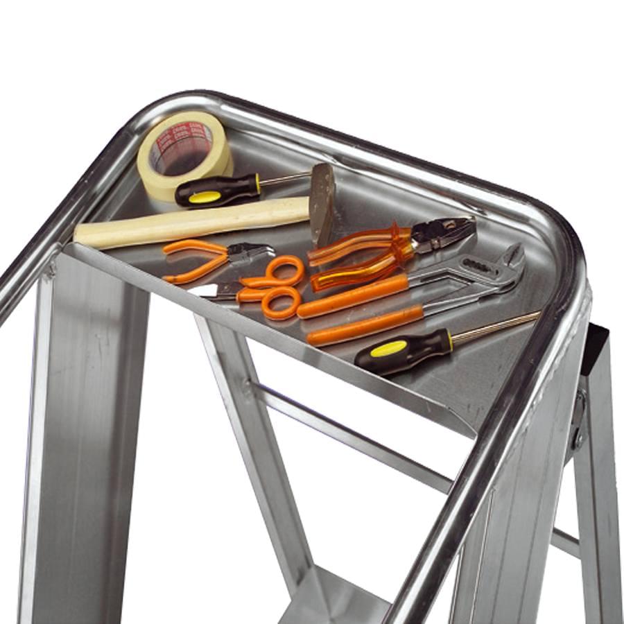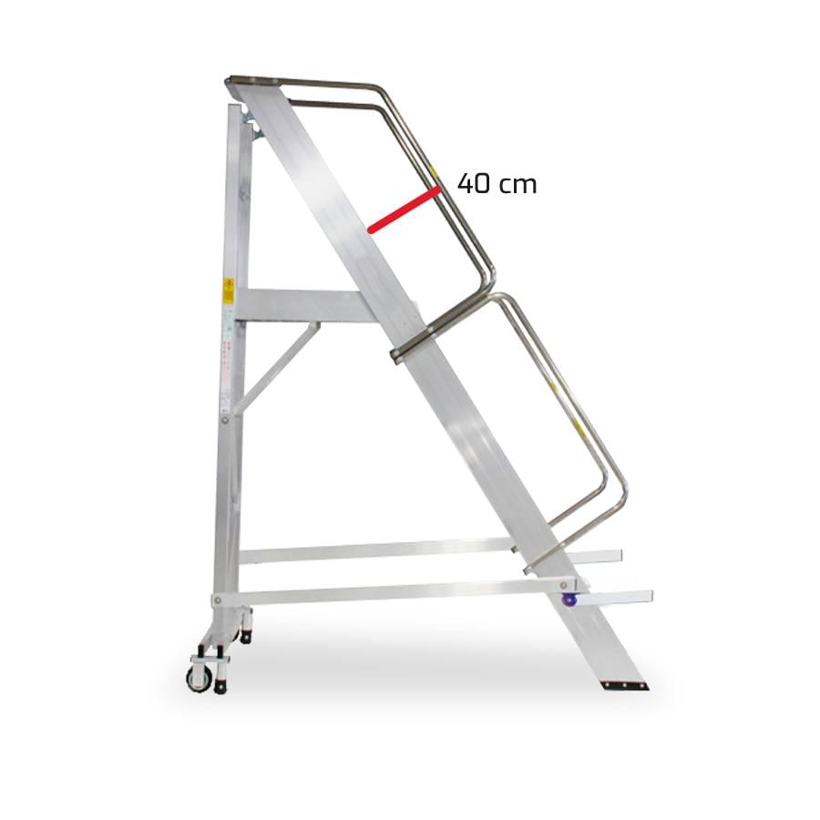 Escabeau de stockage spécialement conçue pour les ouvriers qui ont besoin de rester en hauteur pendant une longue période, avec une grande commodité (entrepôts, cimetières, lieux d’entretien, grands magasins…). Il est fabriqué en aluminium nervuré qui offre une grande robustesse. Des marches soudées aux montants créant une structure très résistante et solide. Il se différencie des autres modèles par sa robustesse (profils 200×30 mm) et par sa partie arrière complètement perpendiculaire au sol, ce qui permet d’approcher l’escabeau complètement aux machines ou à d’autres zones de travail. Très pratique pour sa largeur de montée, de marches de grande profondeur, une large plateforme comprenant des plinthes d’une hauteur de 15 cm et des main courantes, garde-corps d’une hauteur de 1 m, assurant une grande sécurité. Y compris les roues et les poignées spéciales pour faciliter leur transport, l’escabeau se ferme en facilitant leur stockage.
