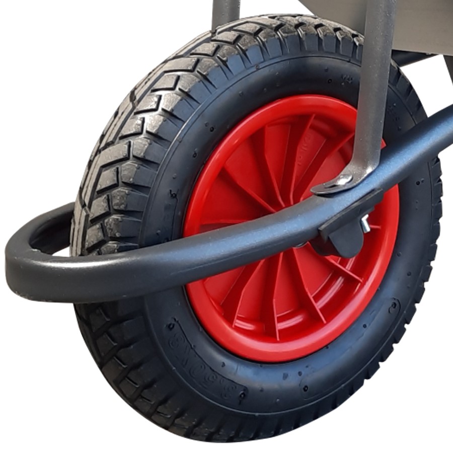 Spécial pour les chantiers grâce à ses dimensions, est un modèle très Compact grâce à ses dimensions 1 530 x 615 x 680 mm, ce qui facilite le passage à travers les portes. La brouette Compact a un tube d’un diamètre 32 mm, est equipée d’une roue d’un diamètre 400 mm et possède d’une jante en plastique renforcé incassable.