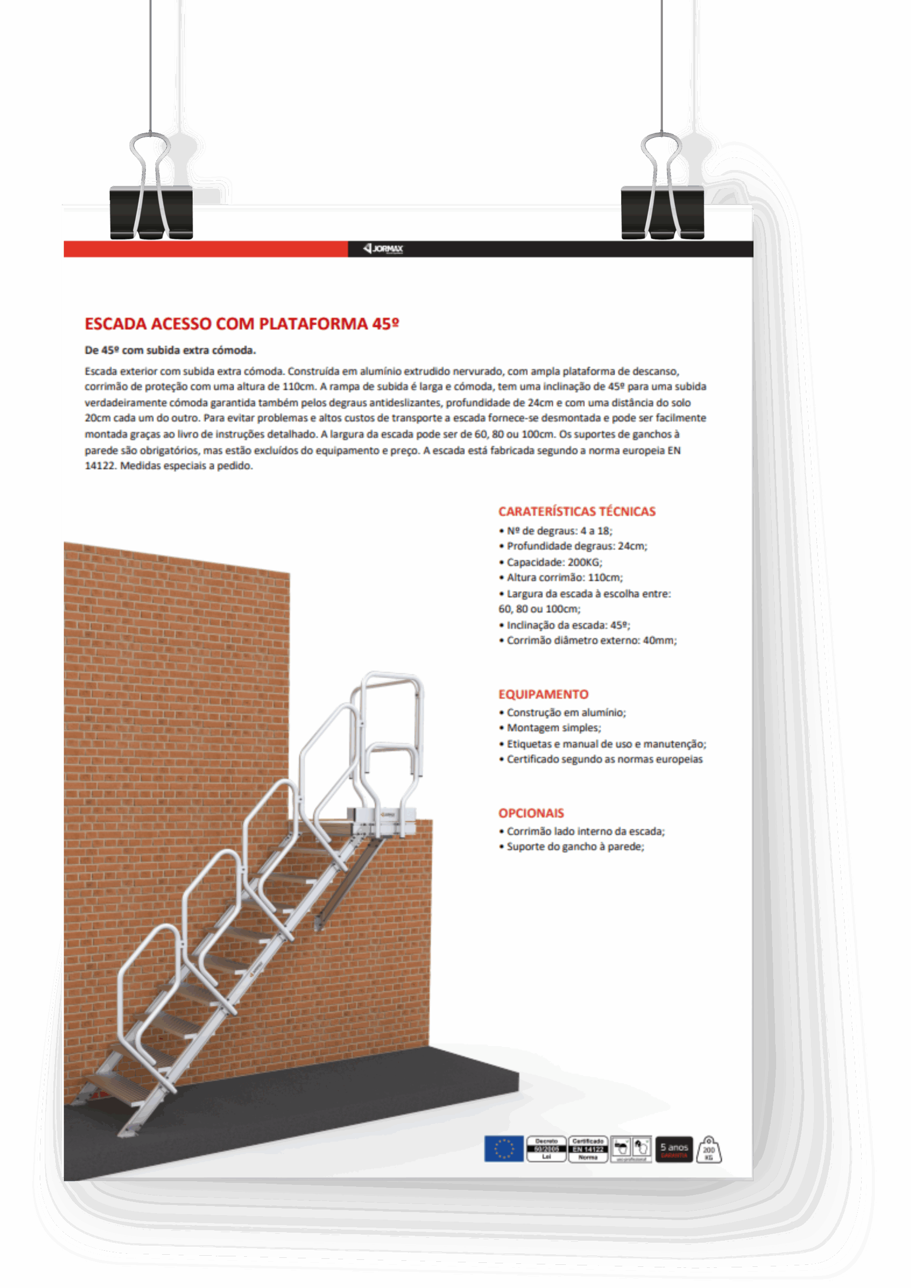 Échelle supplémentaire avec une montée très confortable. Construit en aluminium extrudé côtelé, avec large plateforme de repos, main courante de protection d’une hauteur de 110 cm. La rampe est large et confortable et présente une inclinaison de 45° pour une montée vraiment confortable, également garantie par de marches antidérapants, une profondeur de 24 cm et une distance au sol de 20 cm les unes des autres. Pour éviter les problèmes et les coûts de transport élevés, l’échelle est livrée démontée et peut être facilement assemblée grâce au manuel d’instructions détaillé. La largeur de l’échelle peut être de 60, 80 et 100 cm. Les supports muraux sont obligatoires, mais sont exclus de l’équipement et du prix.