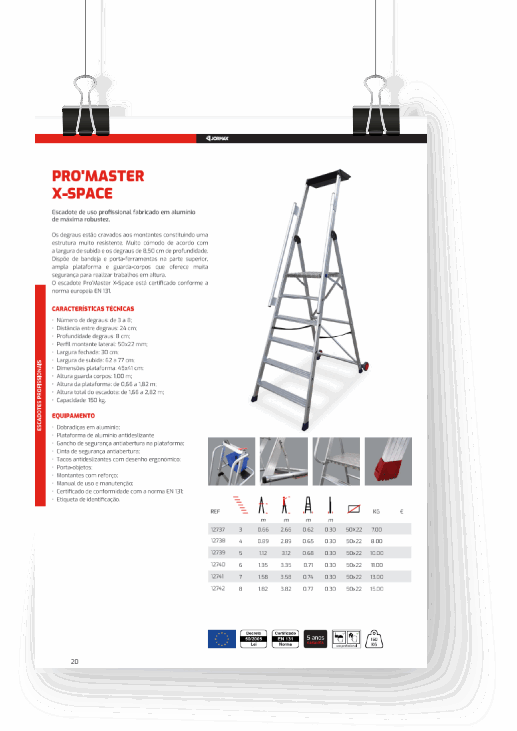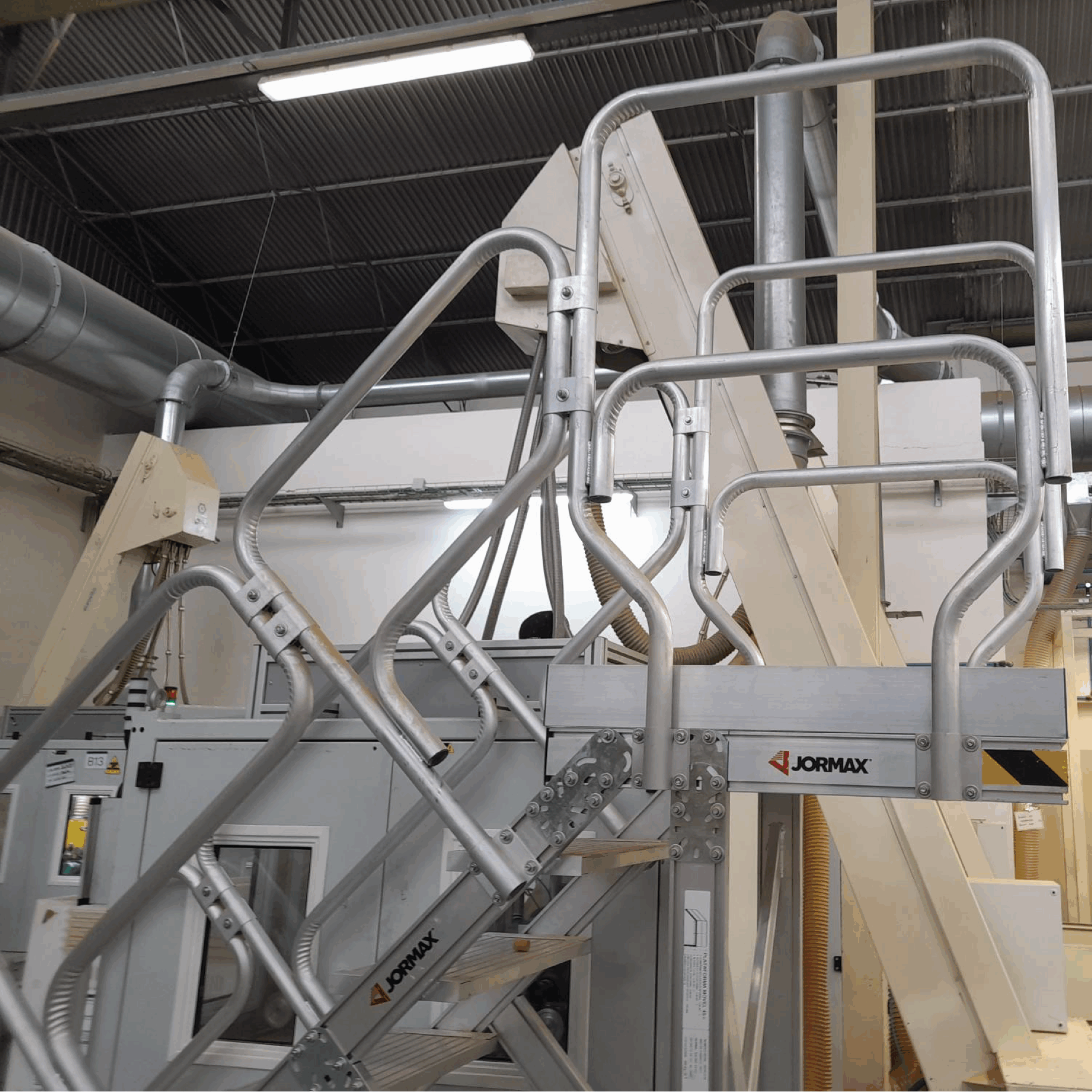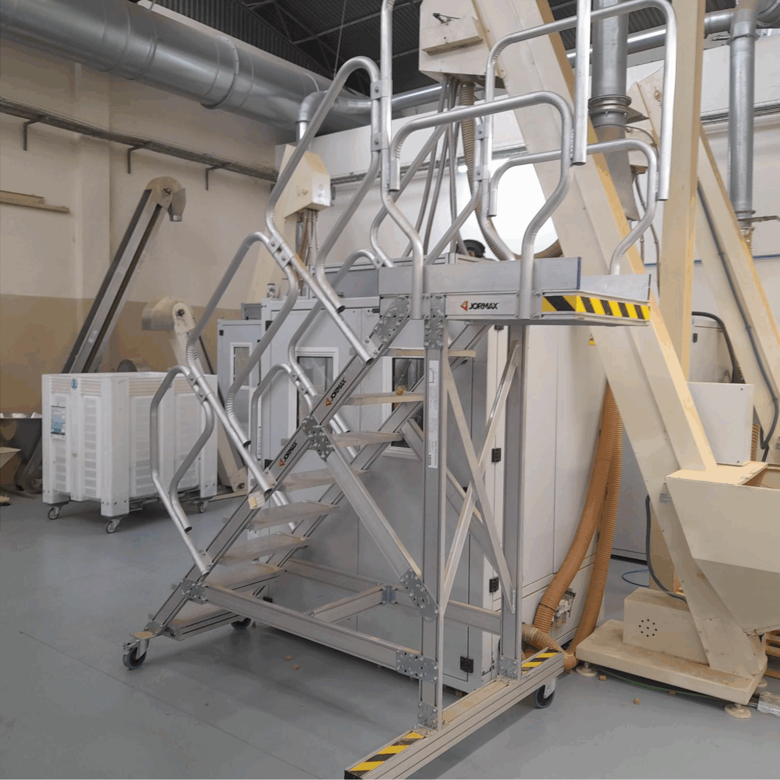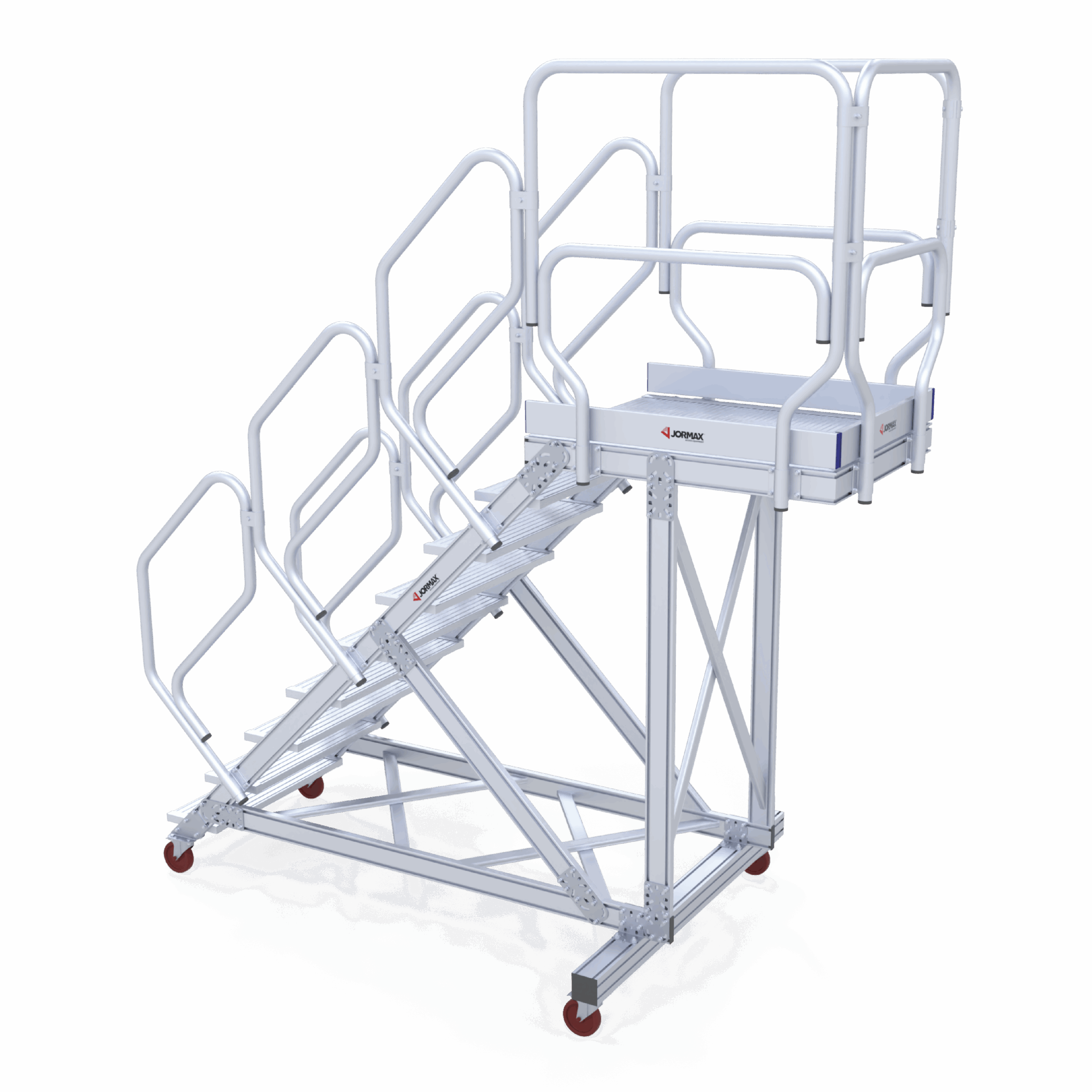 Plateforme mobile suspendue à 45, en aluminium, pour usage professionnel. Avec marches antidérapantes de 15 cm de profondeur. Conçue pour travailler en hauteur dans des endroits présentant des obstacles au sol, elle est disponible en diff érentes longueurs d’avancement. Structure robuste et résistante. La plateforme est équipée de plinthes de 15 cm de hauteur et de garde-corps de 1,10 m sur 3 côtés.