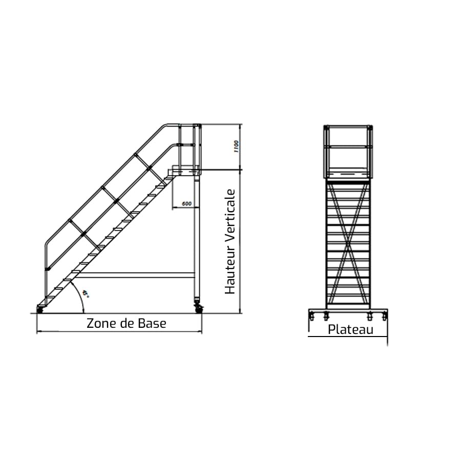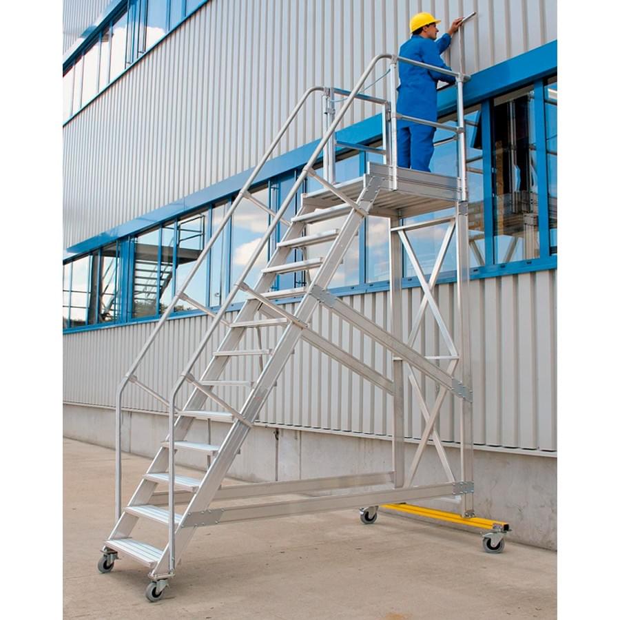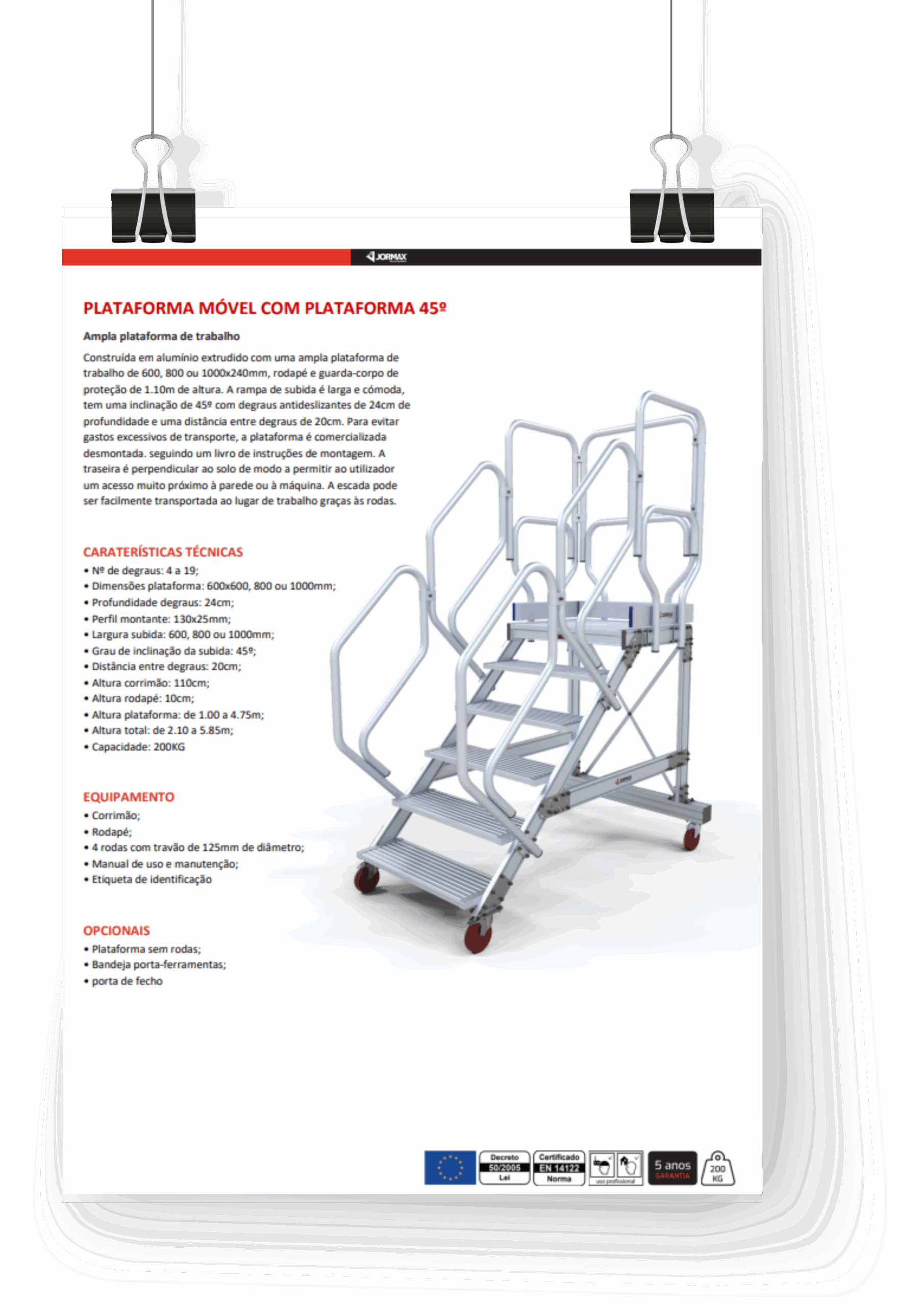 Construit en aluminium extrudé avec une large plateforme de travail 600 800 et 1000×240 mm, plinthe et guard-corps de protection de 1,10 m de hauteur. La rampe de montée est large et confortable, une inclinaison de 45° avec des marches antidérapants de 25 cm de profondeur et une distance entre marches de 25 cm. Pour éviter des coûts de transport excessifs, la plateforme est commercialisée démontée à la suite d’un manuel d’instructions de montage. L’arrière est perpendiculaire au sol afin de permettre à l’utilisateur un accès très proche au mur ou à la machine. La plateforme peut être facilement transportée sur le lieu de travail grâce aux roues.