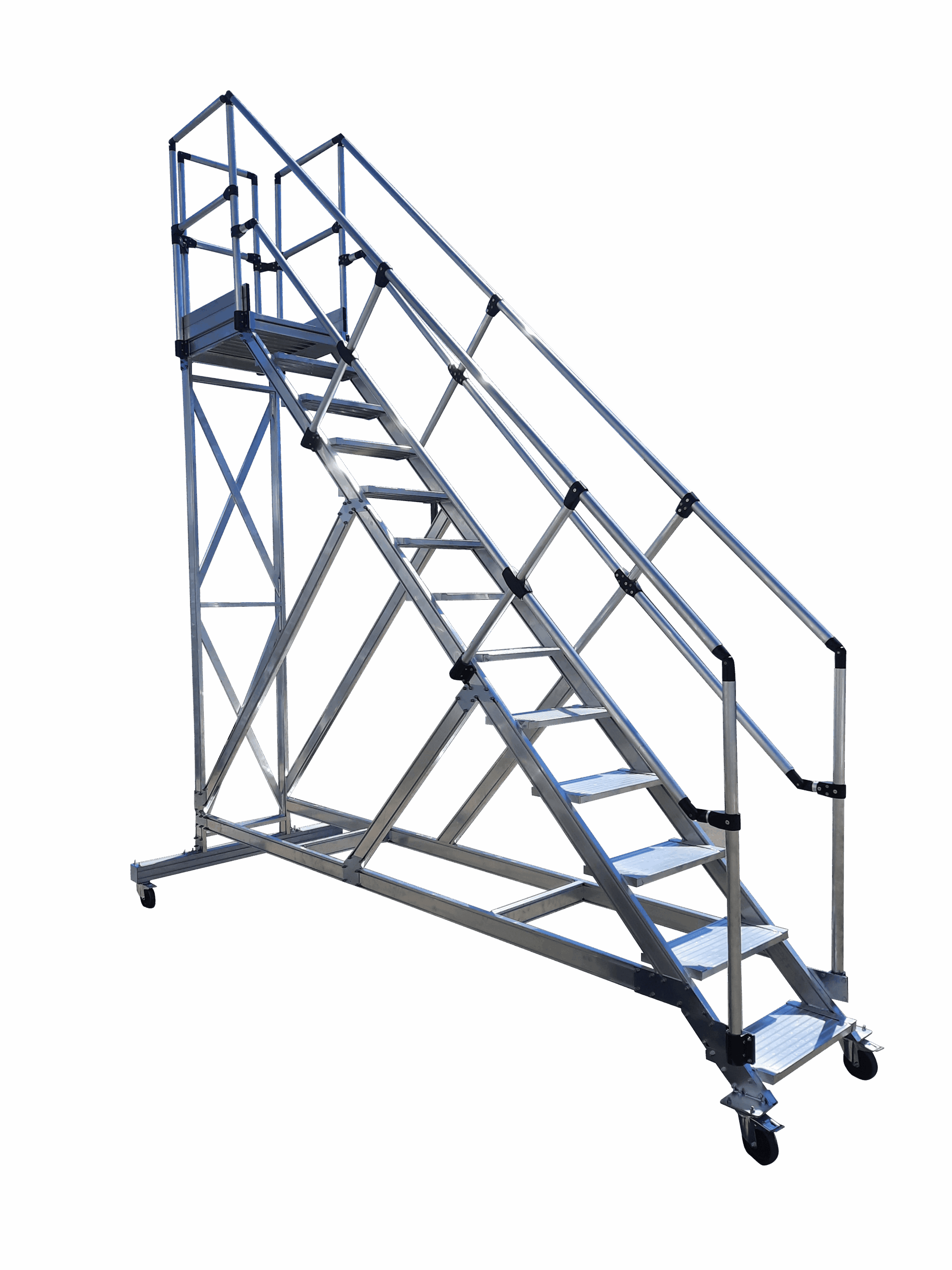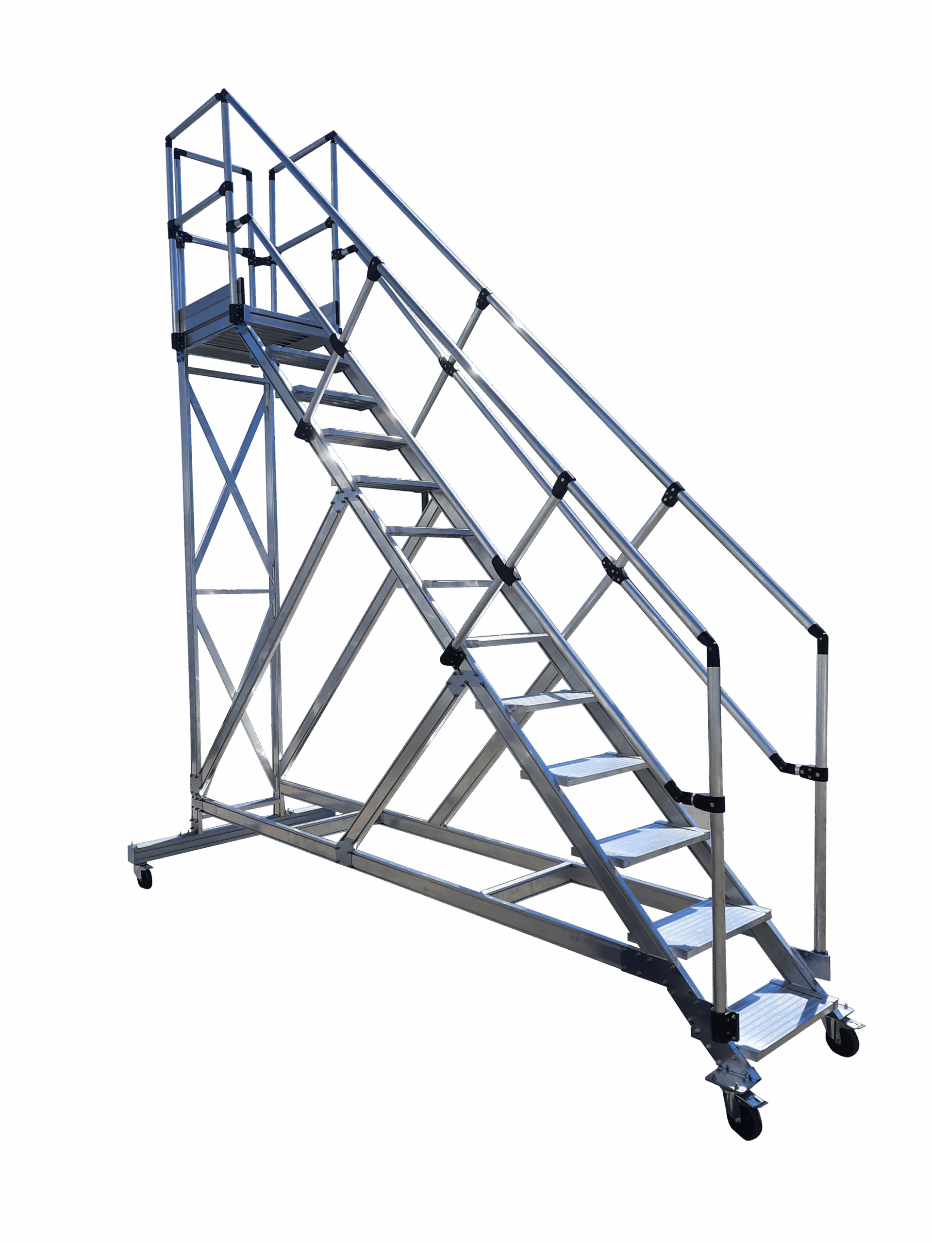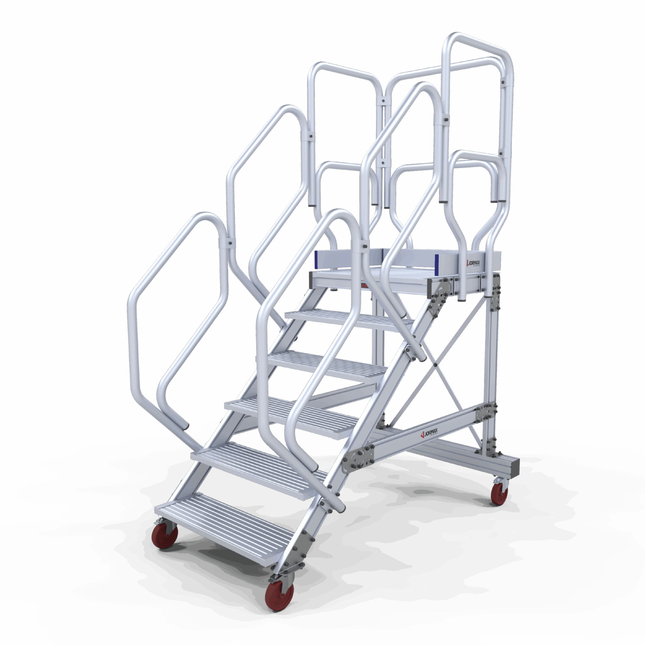 Construit en aluminium extrudé avec une large plateforme de travail 600 800 et 1000×240 mm, plinthe et guard-corps de protection de 1,10 m de hauteur. La rampe de montée est large et confortable, une inclinaison de 45° avec des marches antidérapants de 25 cm de profondeur et une distance entre marches de 25 cm. Pour éviter des coûts de transport excessifs, la plateforme est commercialisée démontée à la suite d’un manuel d’instructions de montage. L’arrière est perpendiculaire au sol afin de permettre à l’utilisateur un accès très proche au mur ou à la machine. La plateforme peut être facilement transportée sur le lieu de travail grâce aux roues.