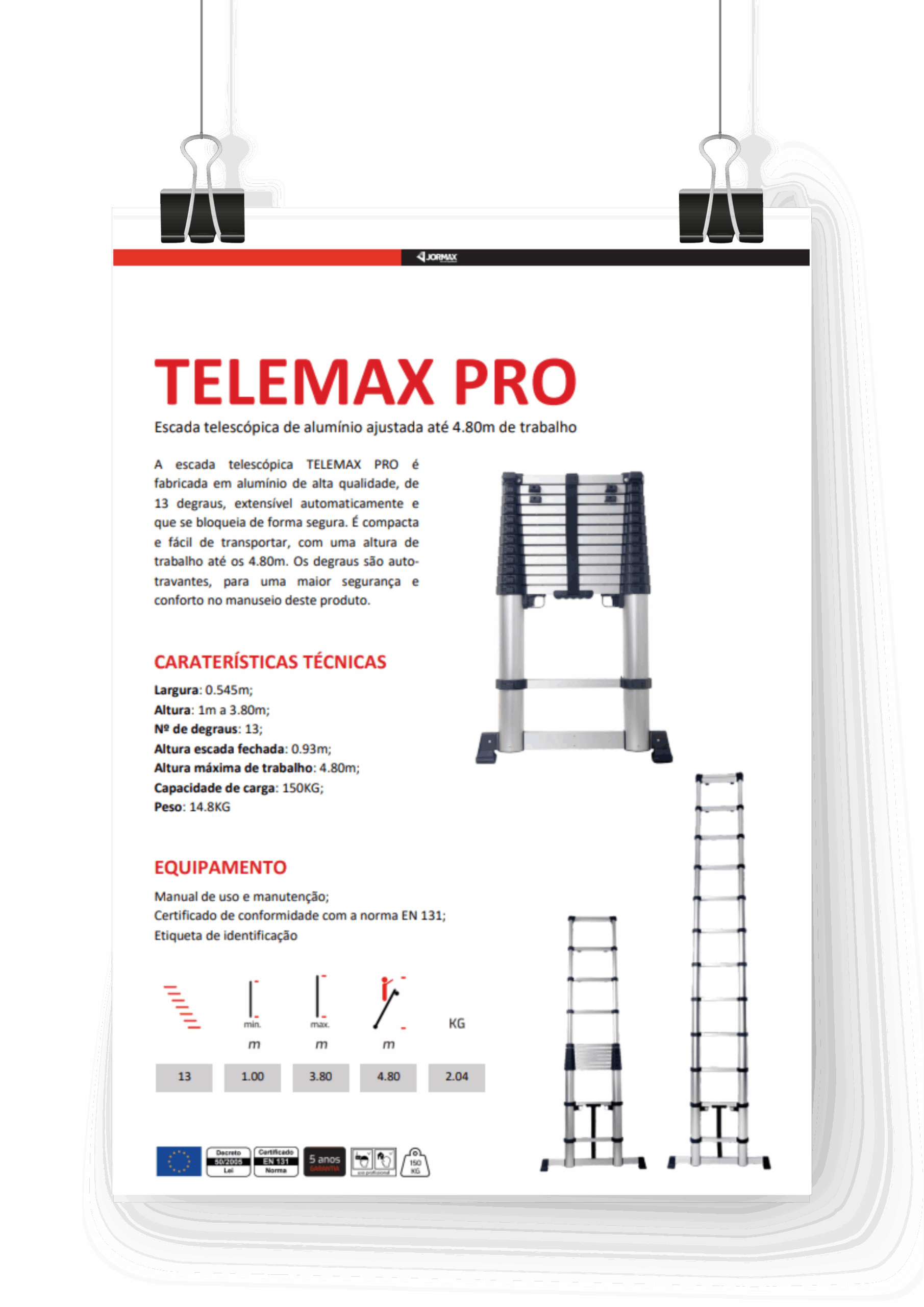 L’échelle télescopique TELEMAX PRO est fabriquée en aluminium de haute qualité, avec 13 échelons, extensible automatiquement et se verrouillant en toute sécurité. Elle est compacte et facile à transporter, avec une hauteur de travail allant jusqu’à 4,80 m. Les échelons sont auto-bloquants, pour une sécurité et un confort accrus lors de la manipulation de ce produit.