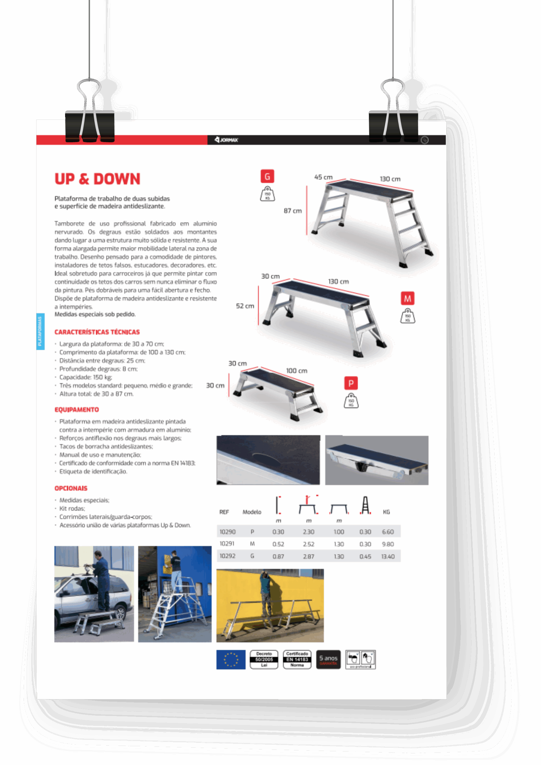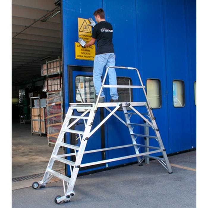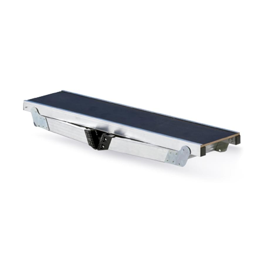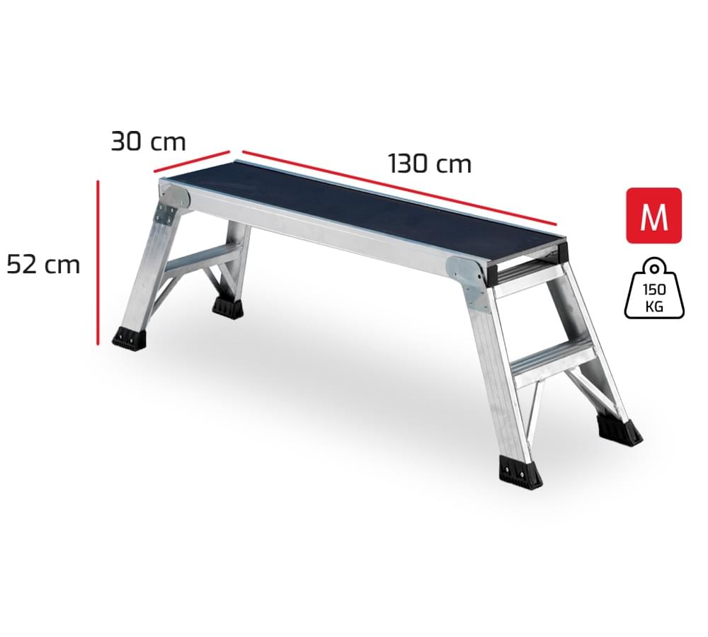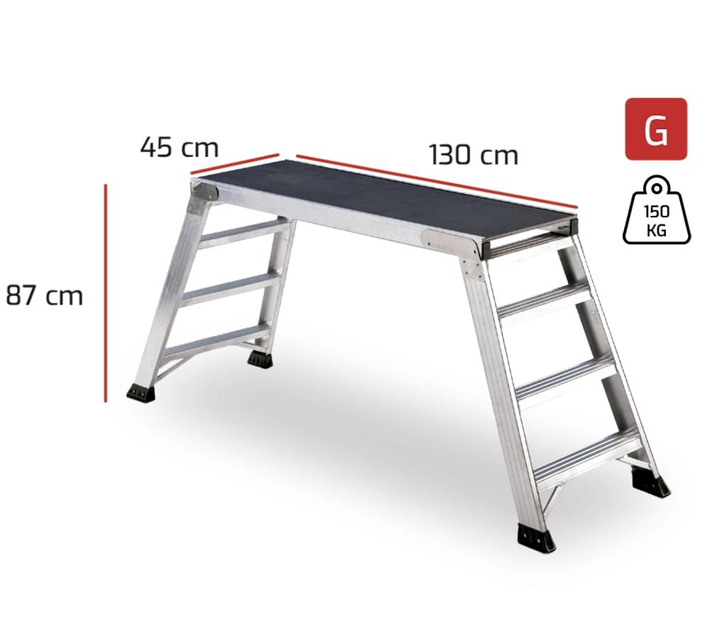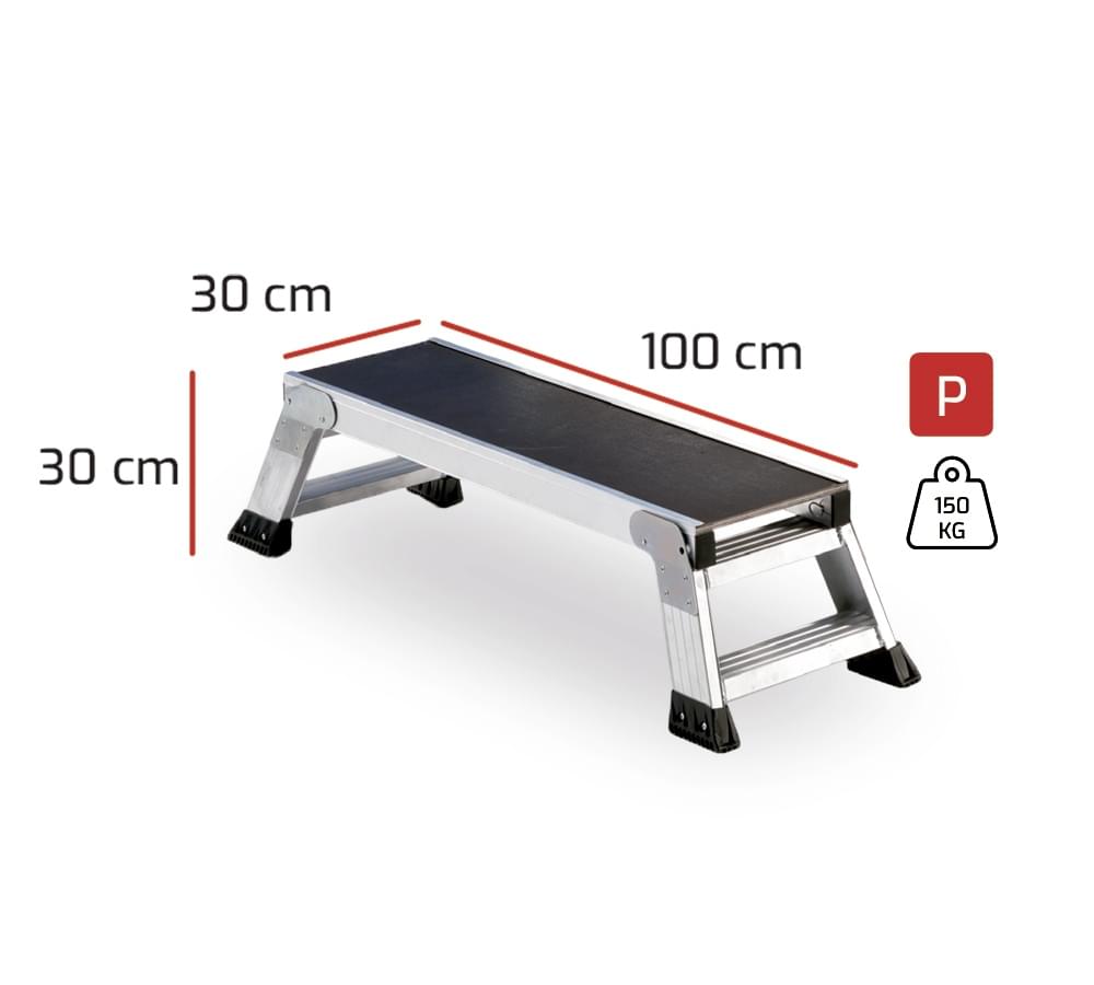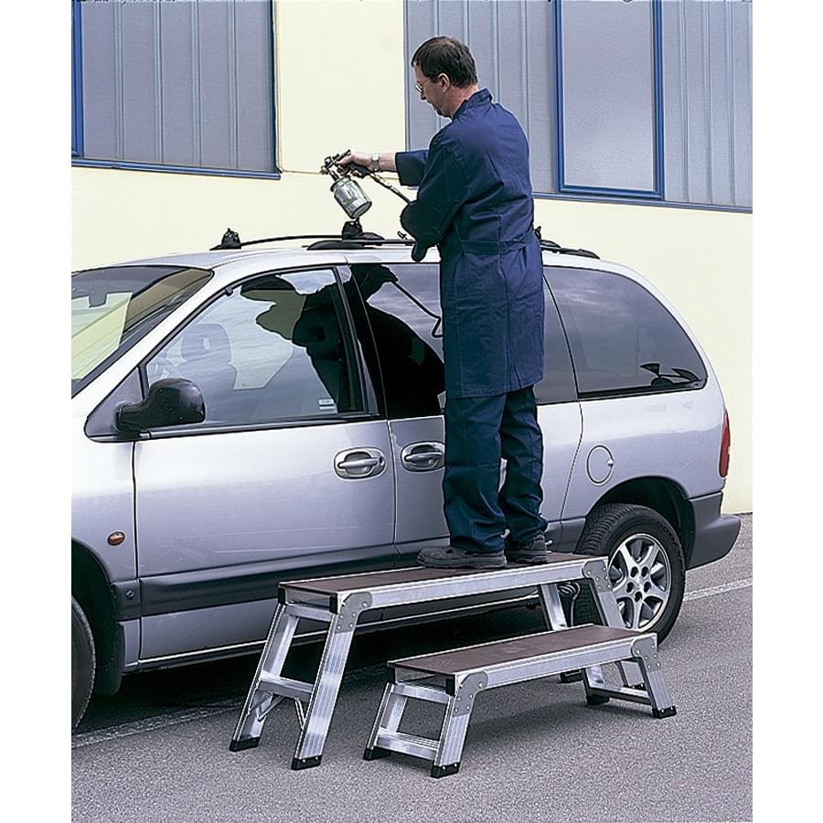 Tabouret professionnel en aluminium nervuré. Les marches sont soudées aux montants, ce qui donne une structure très solide et robuste. Sa forme large permet une plus grande mobilité latérale dans la zone de travail. Dessin conçu pour le confort des peintres, des installateurs de faux plafonds, des plâtriers, des décorateurs, etc. Idéal surtout pour les carcasses car il permet de peindre avec continuité les plafonds des voitures sans jamais éliminer le flux de la peinture. Pieds pliables pour une ouverture et une fermeture faciles. Il a une plateforme en bois antidérapante et résistant aux intempéries.