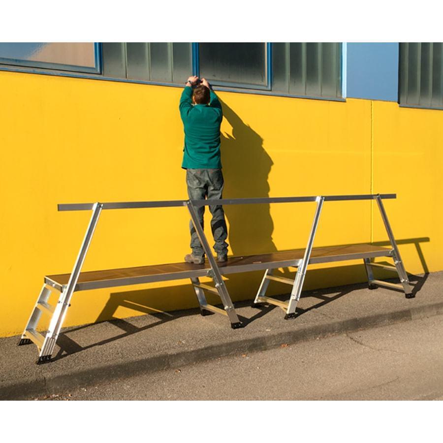 Plateforme de travail à double montée et surface en bois antidérapante.