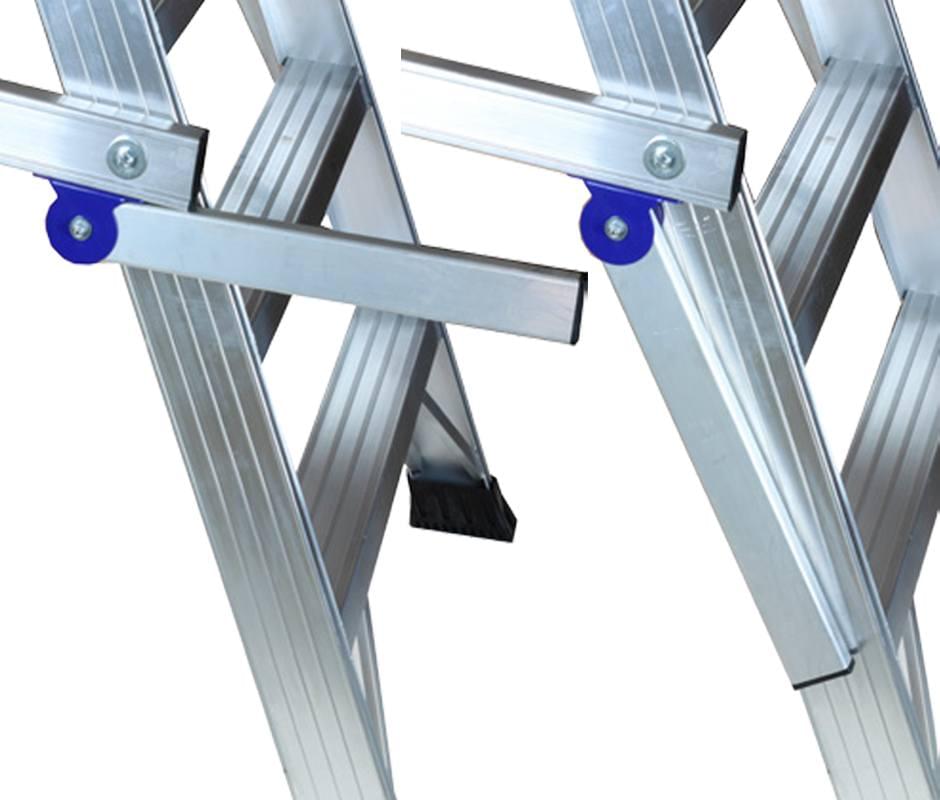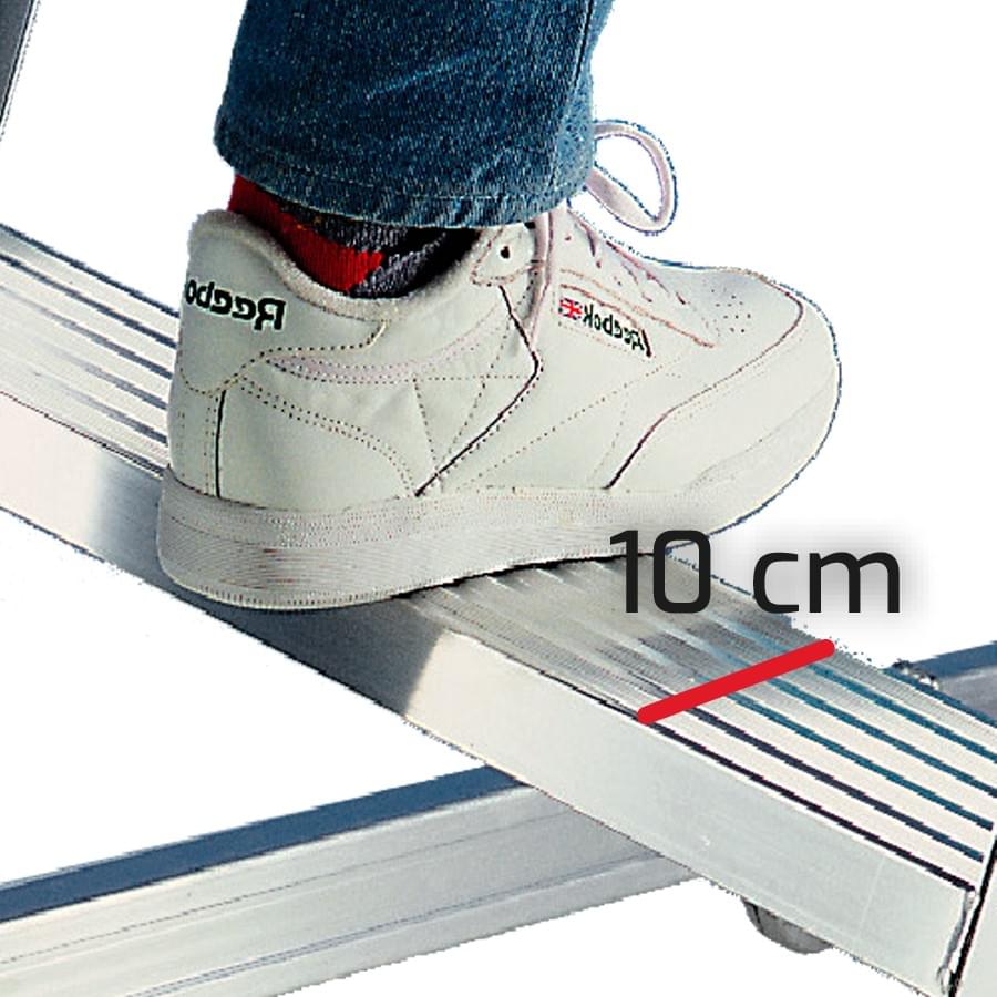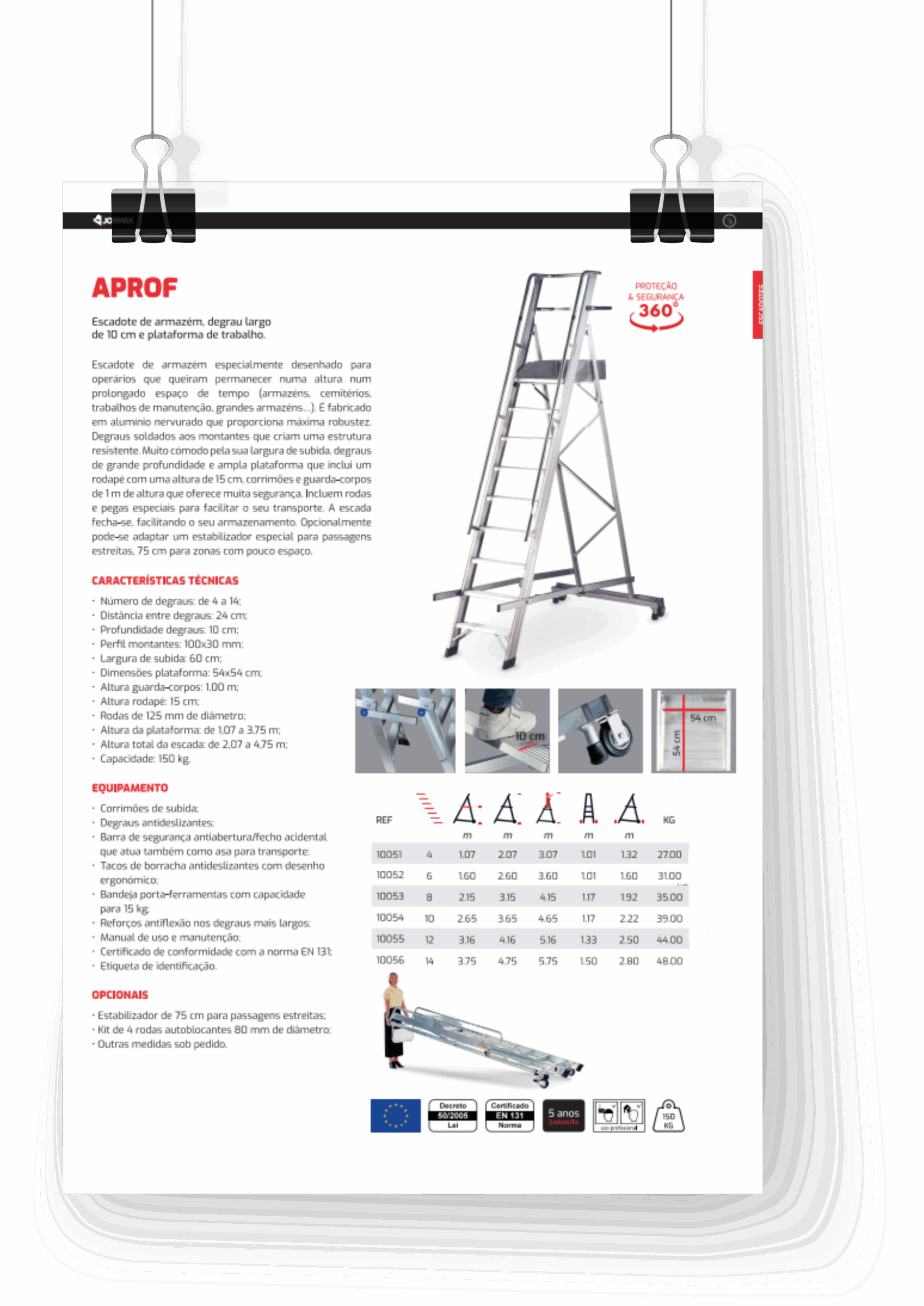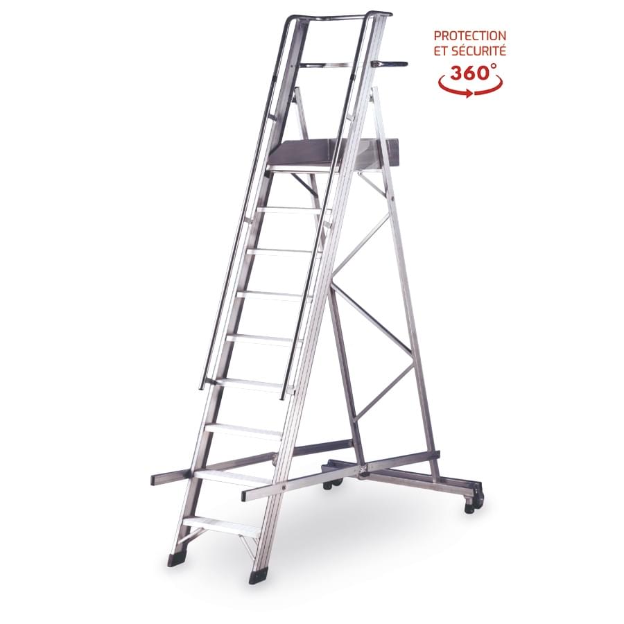 Escabeau de stockage spécialement conçue pour les ouvriers qui veulent rester à une hauteur prolongée dans un espace de temps (entrepôts, cimetières, travaux d’entretien, grands entrepôts…). Il est fabriqué en aluminium nervuré qui offre une robustesse maximale. Marches soudées aux montants qui créent une structure résistante. Très pratique pour sa largeur de montée, de marches de grande profondeur et une large plateforme qui comprend un pied de page avec une hauteur de 15 cm, balcons et garde-corps de 1 m de hauteur qui offre une grande sécurité. Elles comprennent des roues et des poignées spéciales pour faciliter leur transport. L’escabeau se ferme en facilitant leur stockage. Facultatif, un stabilisateur spécial peut être adapté pour les passages étroits, 75 cm pour les zones à faible espace.