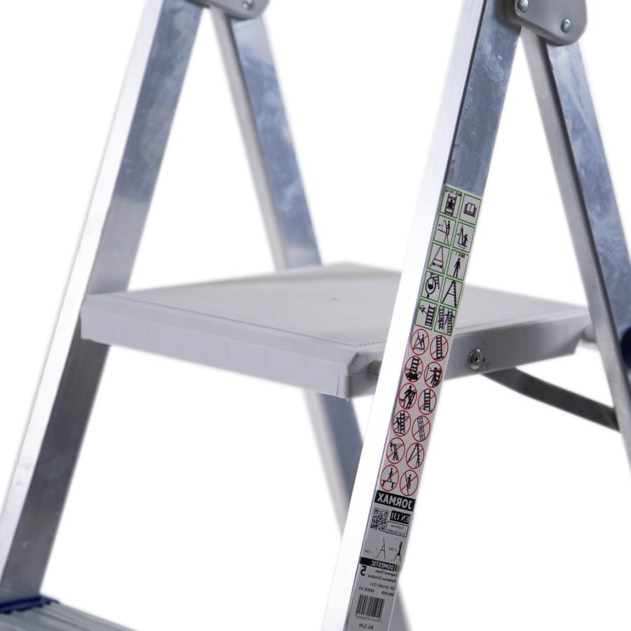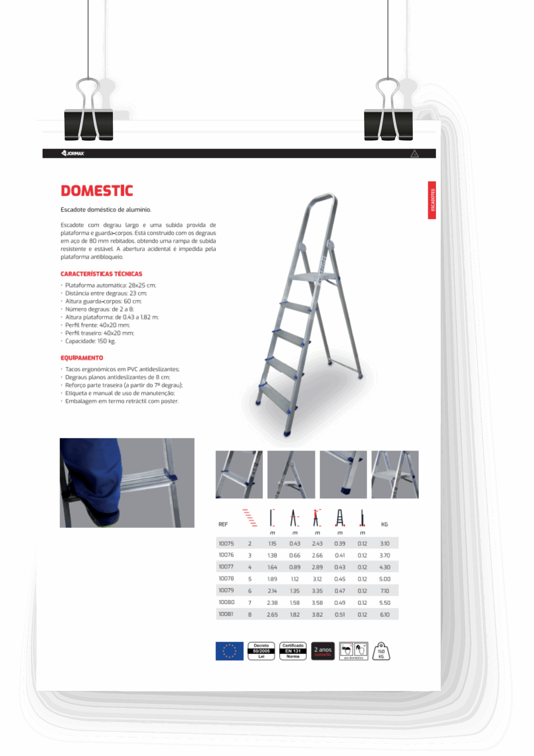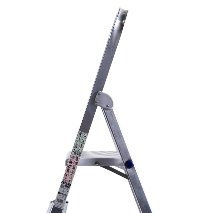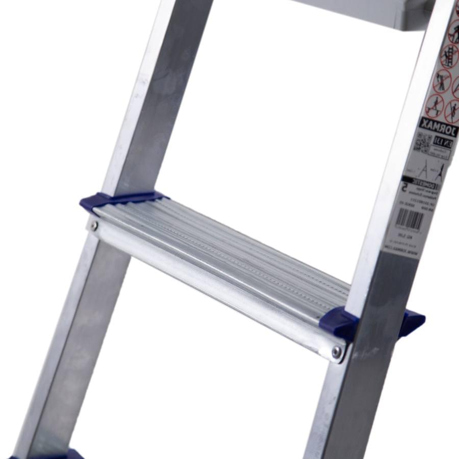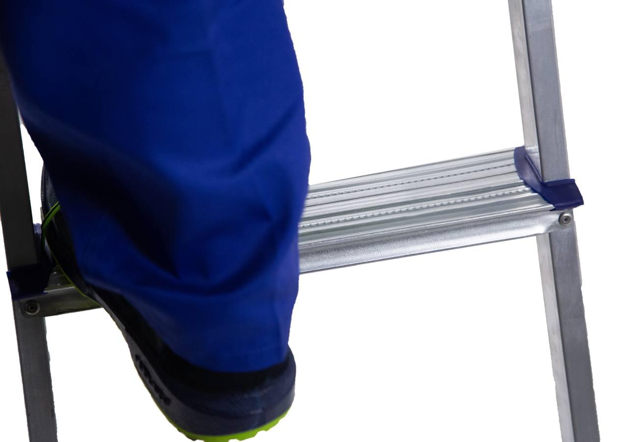 Escabeau avec marche large et une montée pourvue de la plateforme et garde-corps. Il est construit avec de marches en acier de 80 mm rivetées et une rampe de montée robuste et stable. L’ouverture accidentelle est empêchée par la plateforme antiblocage.