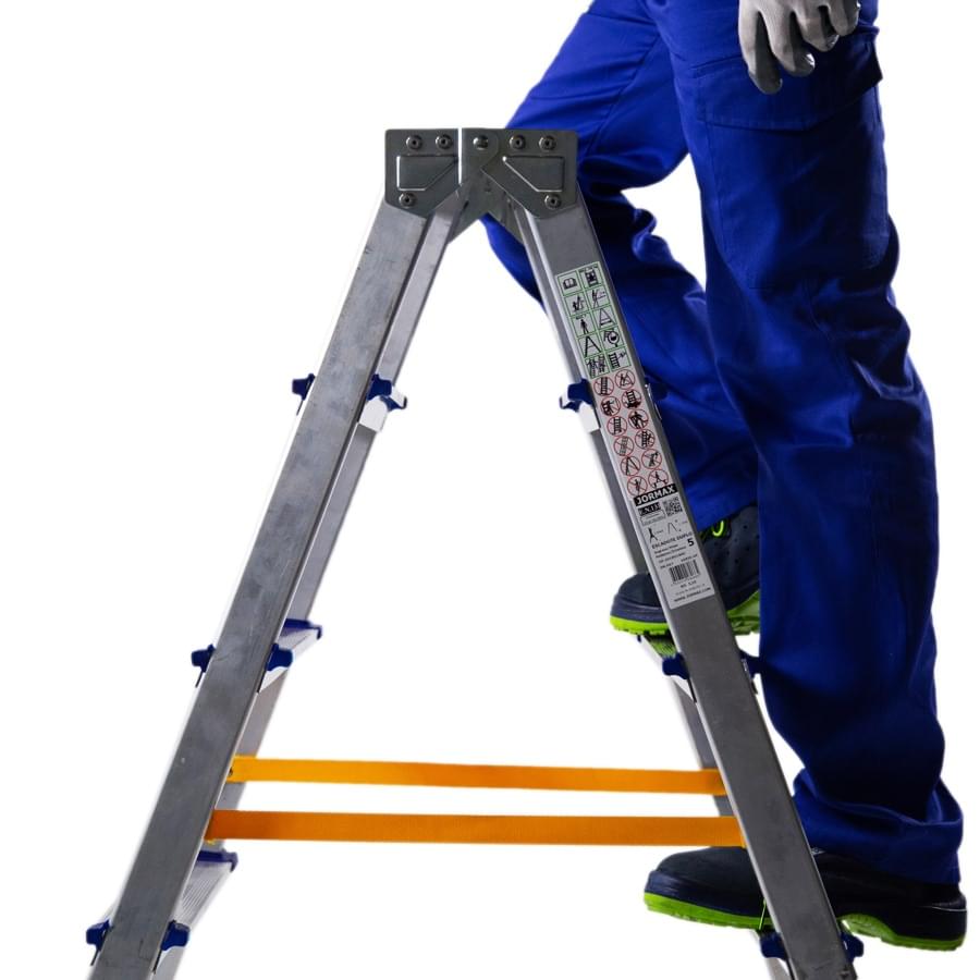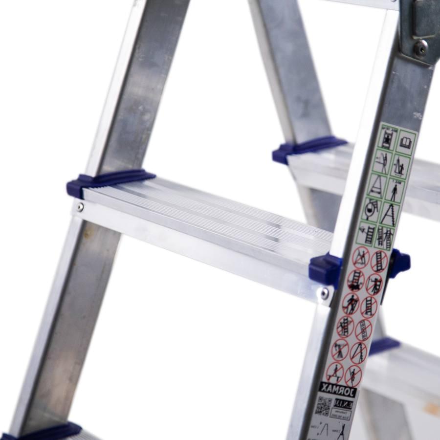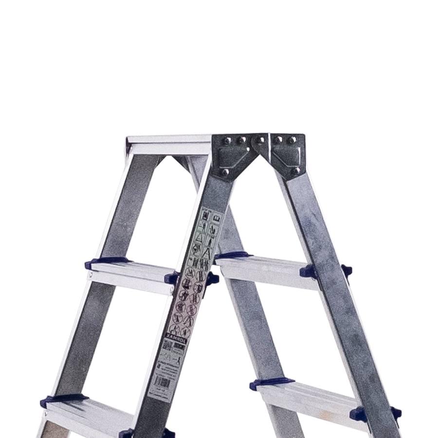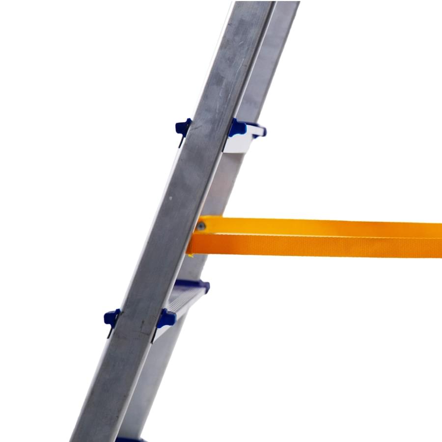 Escabeau en aluminium avec marche large et une montée pourvue de la plateforme et garde-corps. Il est construit avec de marches en aluminium rivetées aux montants, obtenant une rampe de montée robuste et stable. Les ceintures de sécurité empêchent l’ouverture accidentelle.