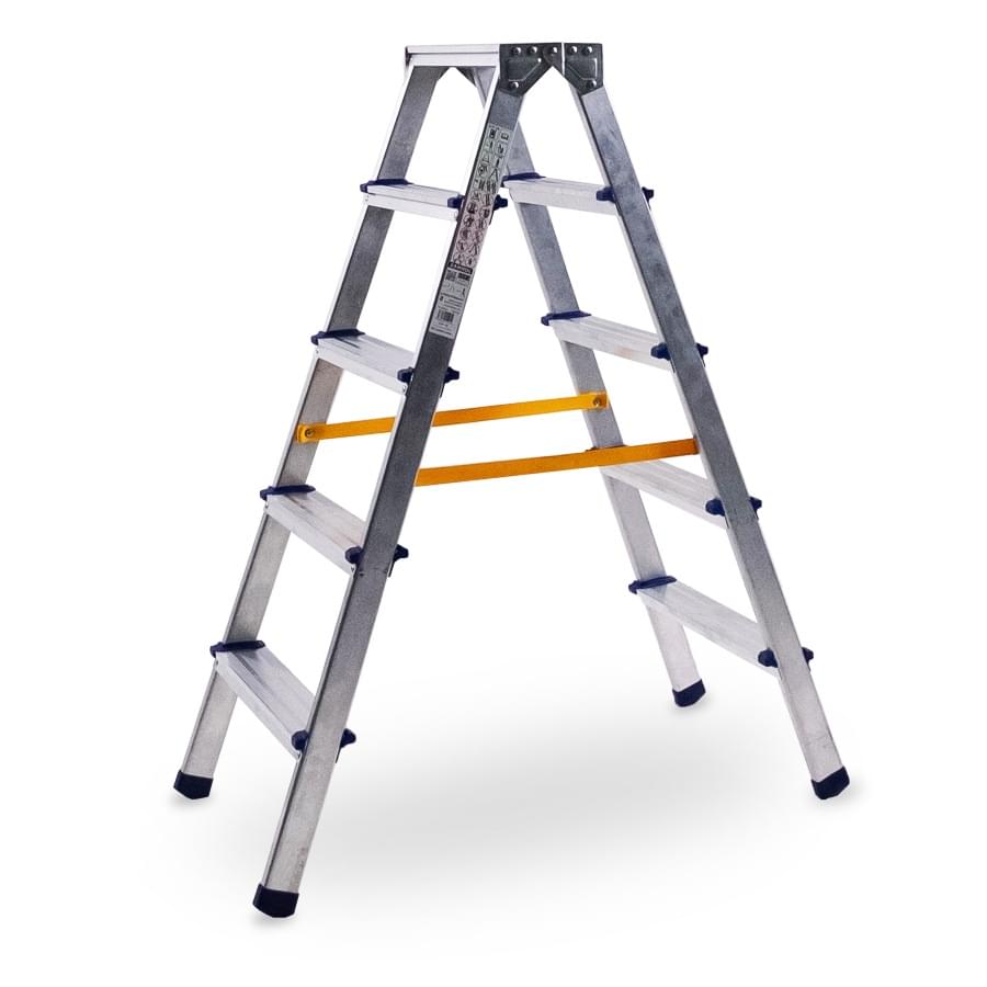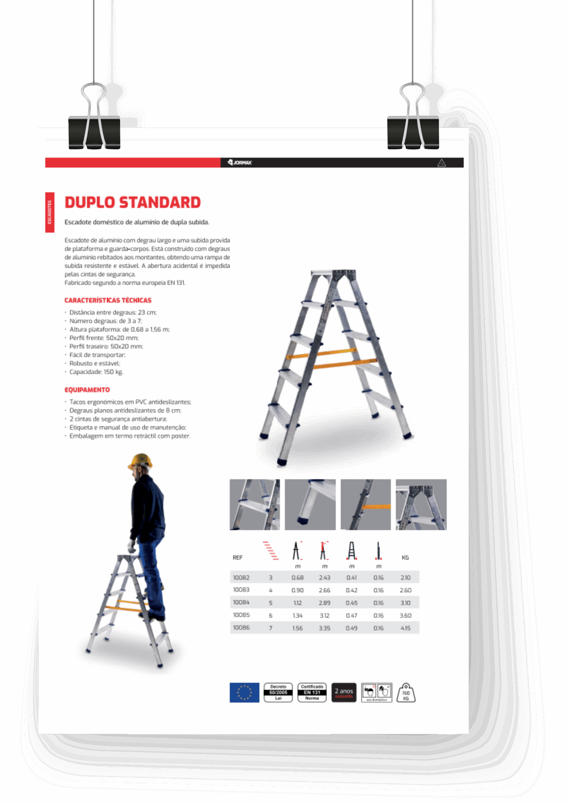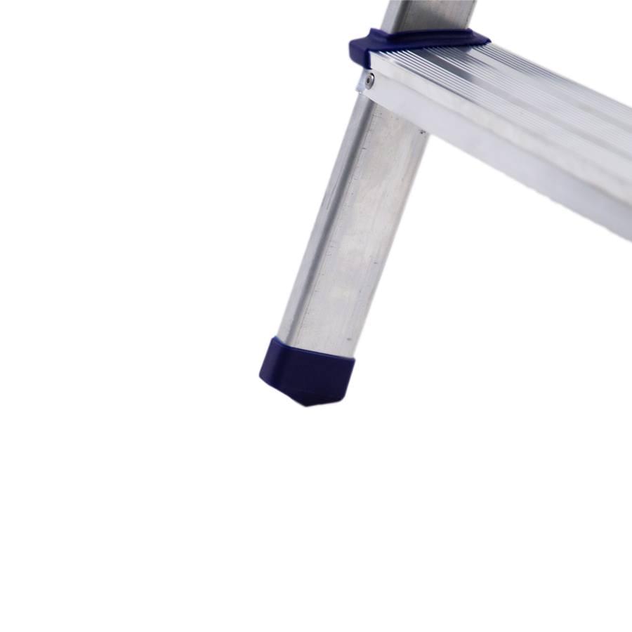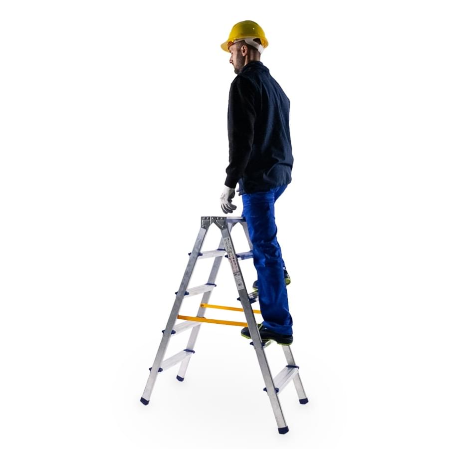 Escabeau en aluminium avec marche large et une montée pourvue de la plateforme et garde-corps. Il est construit avec de marches en aluminium rivetées aux montants, obtenant une rampe de montée robuste et stable. Les ceintures de sécurité empêchent l’ouverture accidentelle.