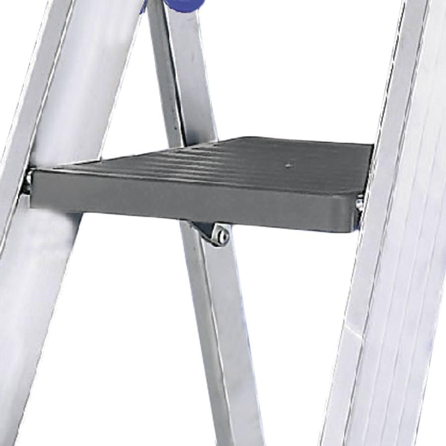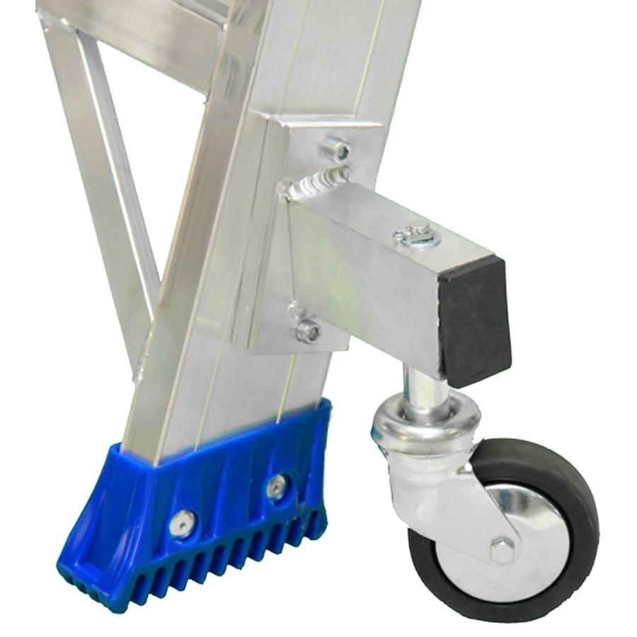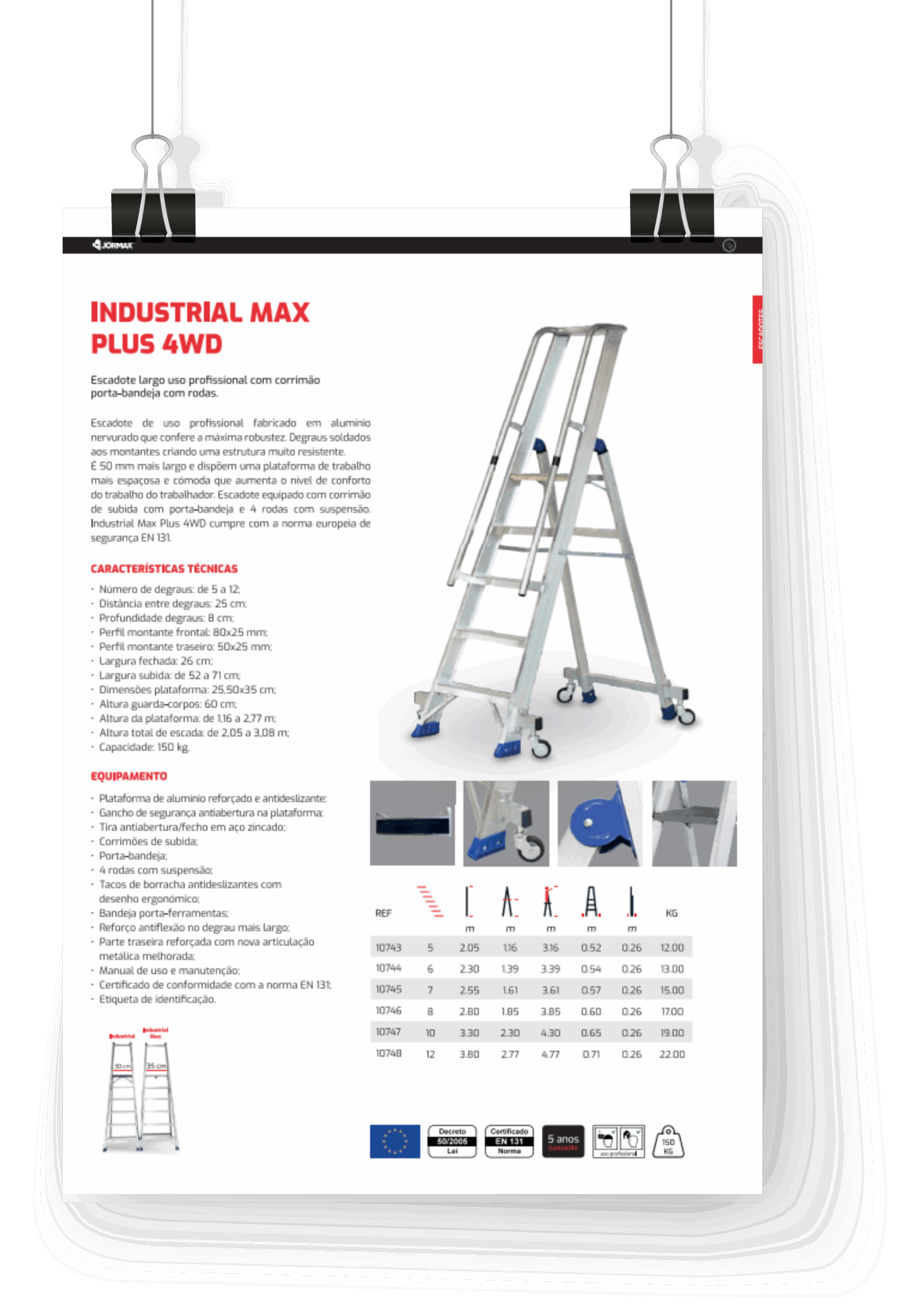 Escabeau à usage professionnel fabriqué en aluminium nervuré qui confère une robustesse maximale. Des marches soudées aux montants créant une structure très résistante. Il est plus large de 50 mm et dispose d’une plateforme de travail plus spacieuse et pratique qui augmente le niveau de confort du travailleur. Escabeau équipé de main courante de montée avec porte-plateau et 4 roues avec suspension. Industrial Max Plus 4WD conforme à la norme européenne de sécurité EN 131.