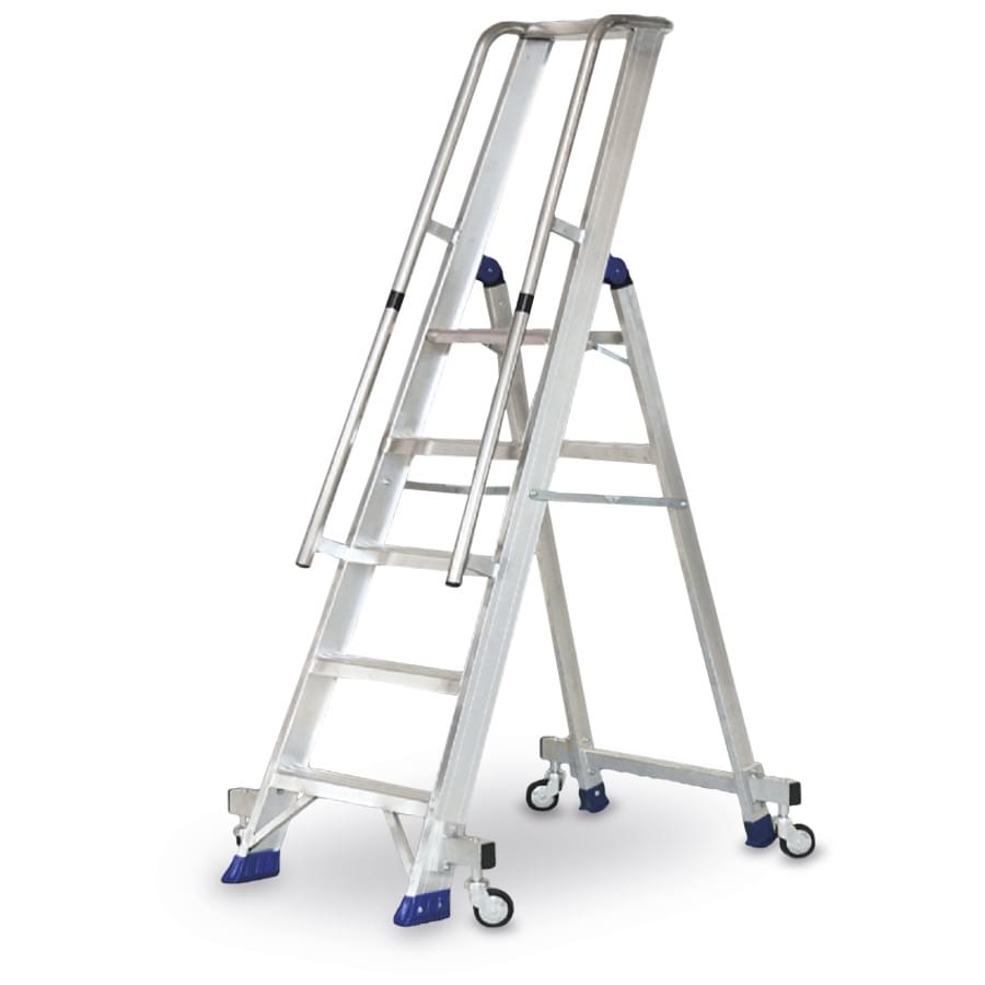 Escabeau large usage professionnel avec main courante porte-plateau avec des roues.