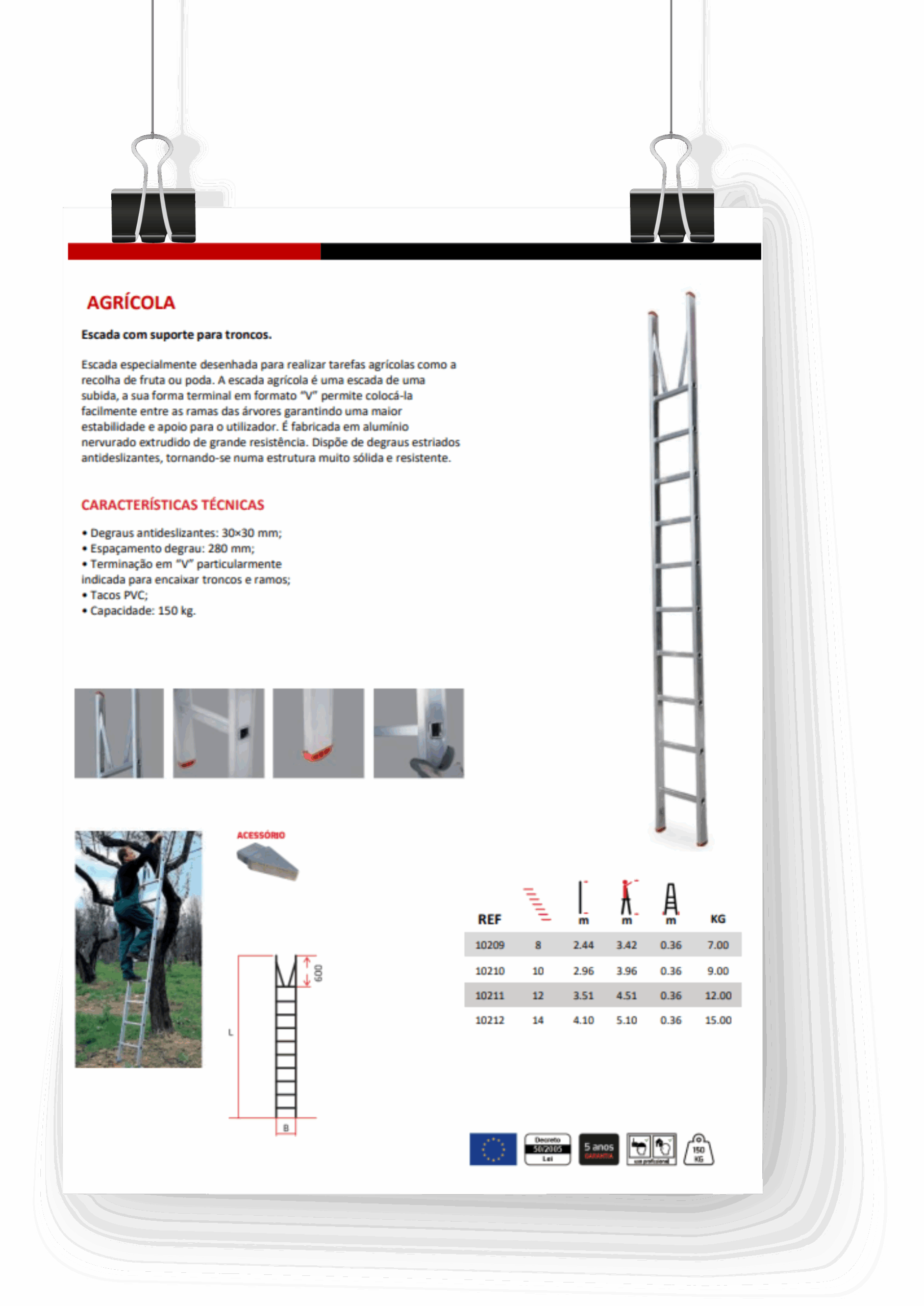 Échelle spécialement conçue pour effectuer des tâches agricoles telles que la cueillette de fruits ou la montant. L’échelle Agrícola est une échelle de montée, sa forme terminale en « V » permet de la placer facilement entre les branches des arbres, assurant ainsi une plus grande stabilité et un meilleur soutien à l’utilisateur. Il est fabriqué en aluminium extrudé nervuré à haute résistance. Ses marches striés antidérapants en font une structure très solide et robuste.