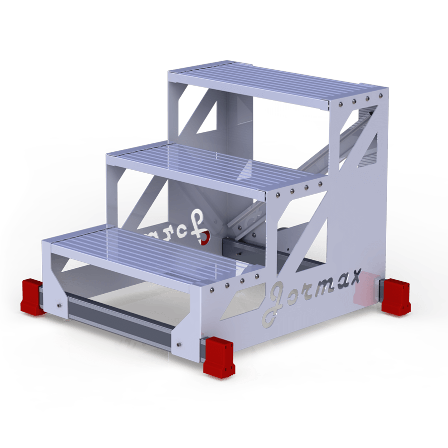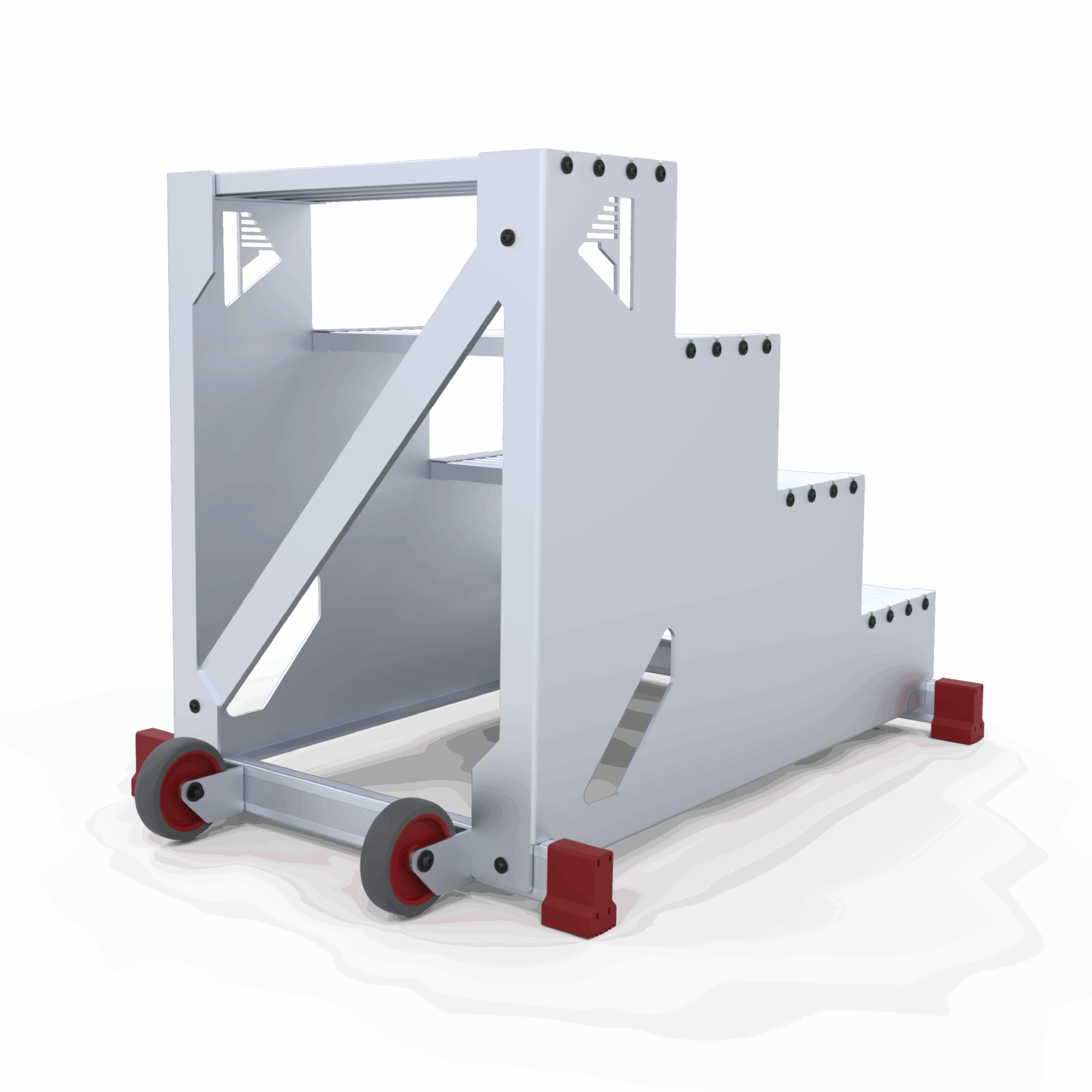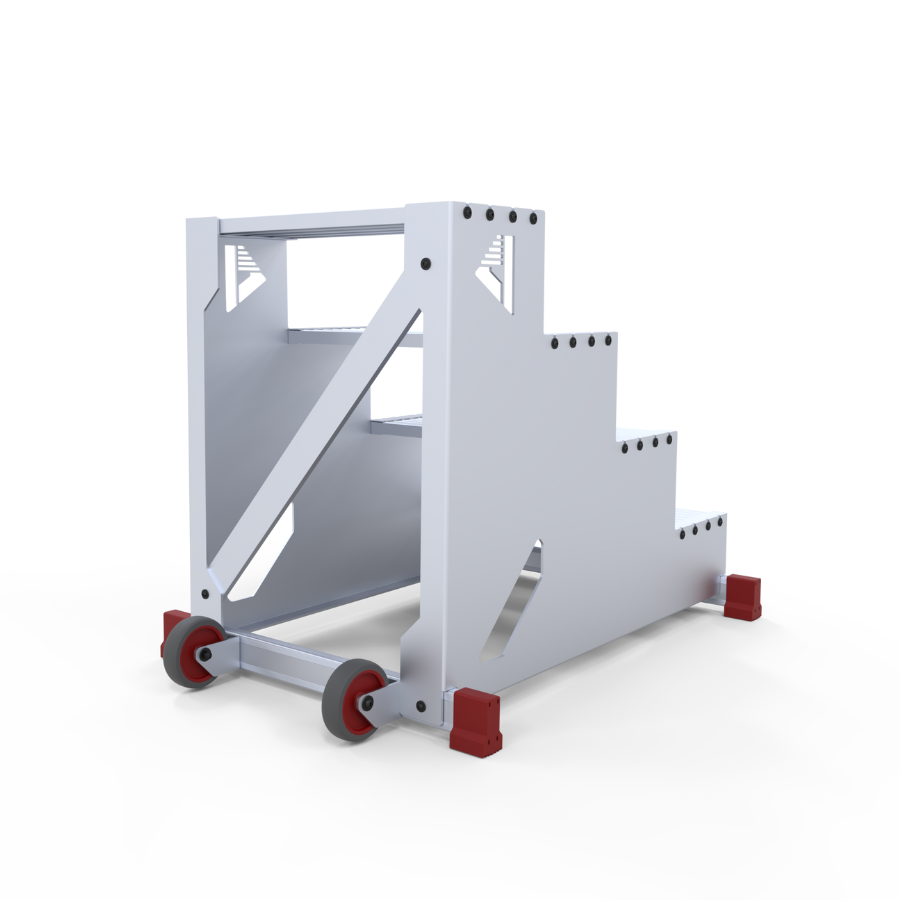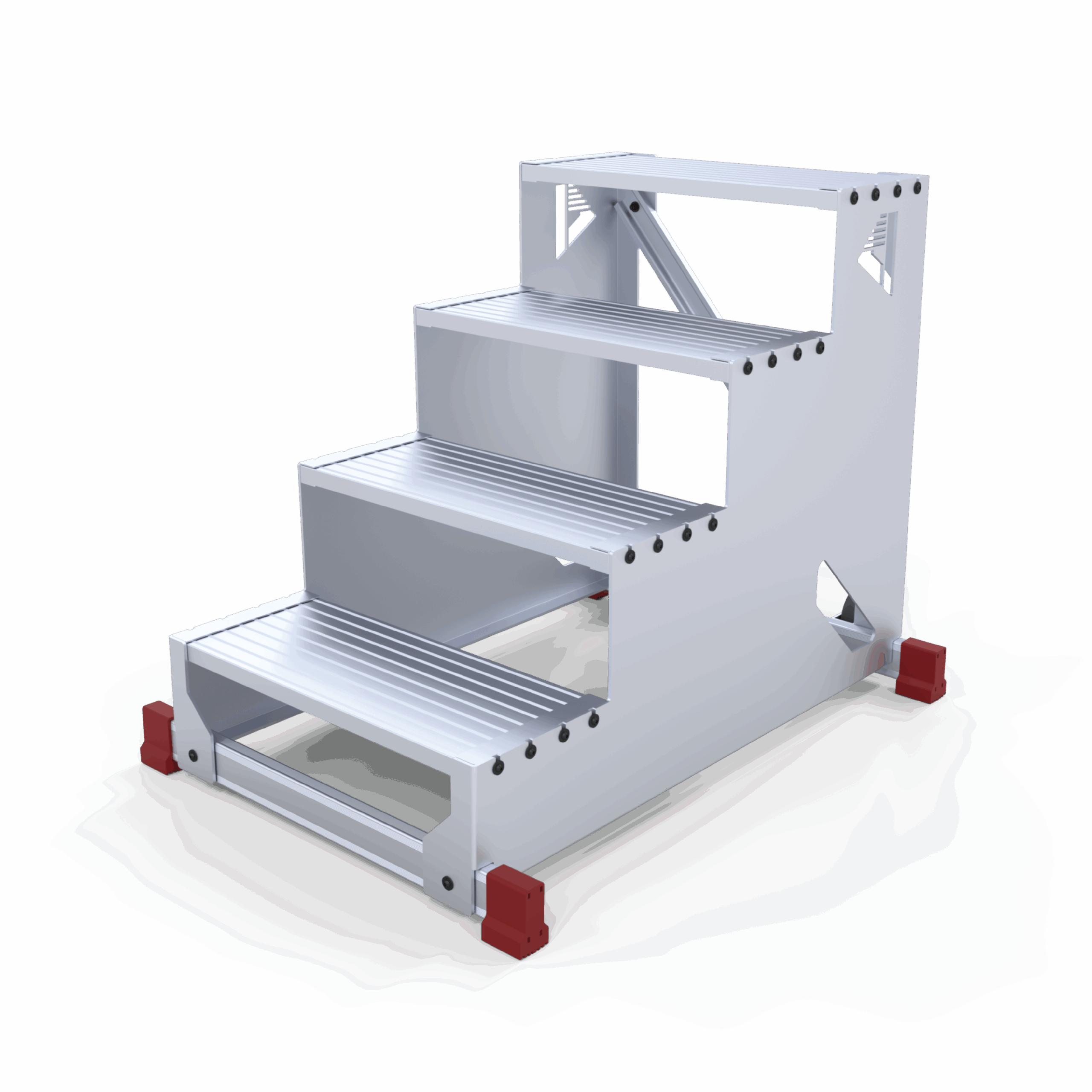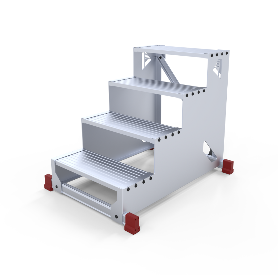 Les marches de grande dimension de 240 mm sont vissées à la structure latérale, créant ainsi une structure très solide et résistante. L’arrière de la plateforme Cargo Tech est perpendiculaire au sol de manière à être complètement appuyée contre le lieu de travail. Équipée de 2 traverses, elle offre une grande surface de support au sol pour une stabilité accrue.
