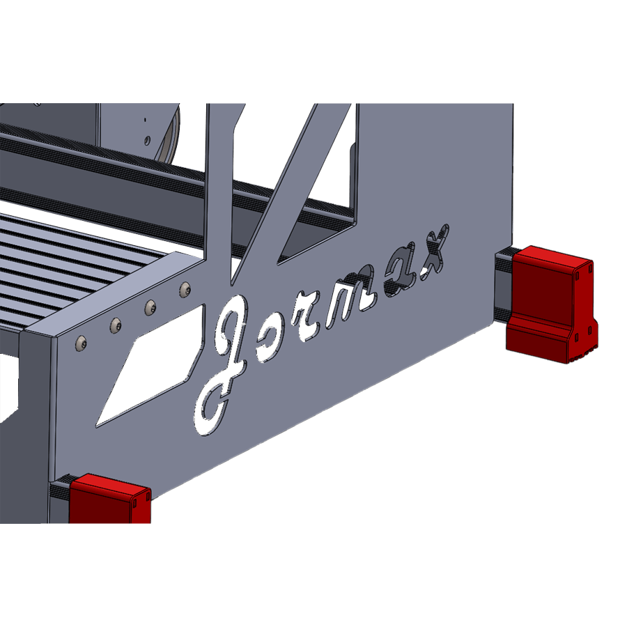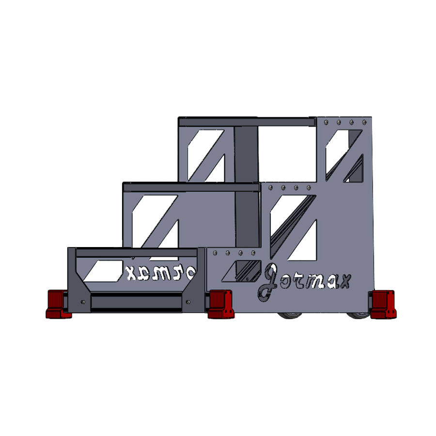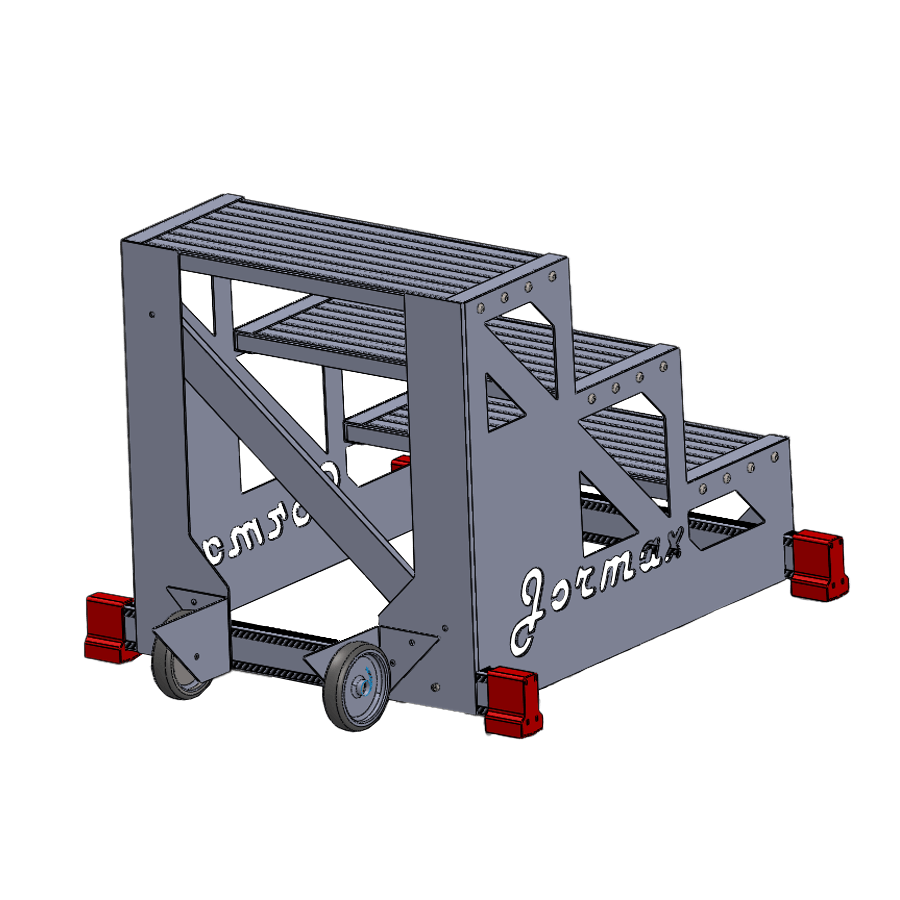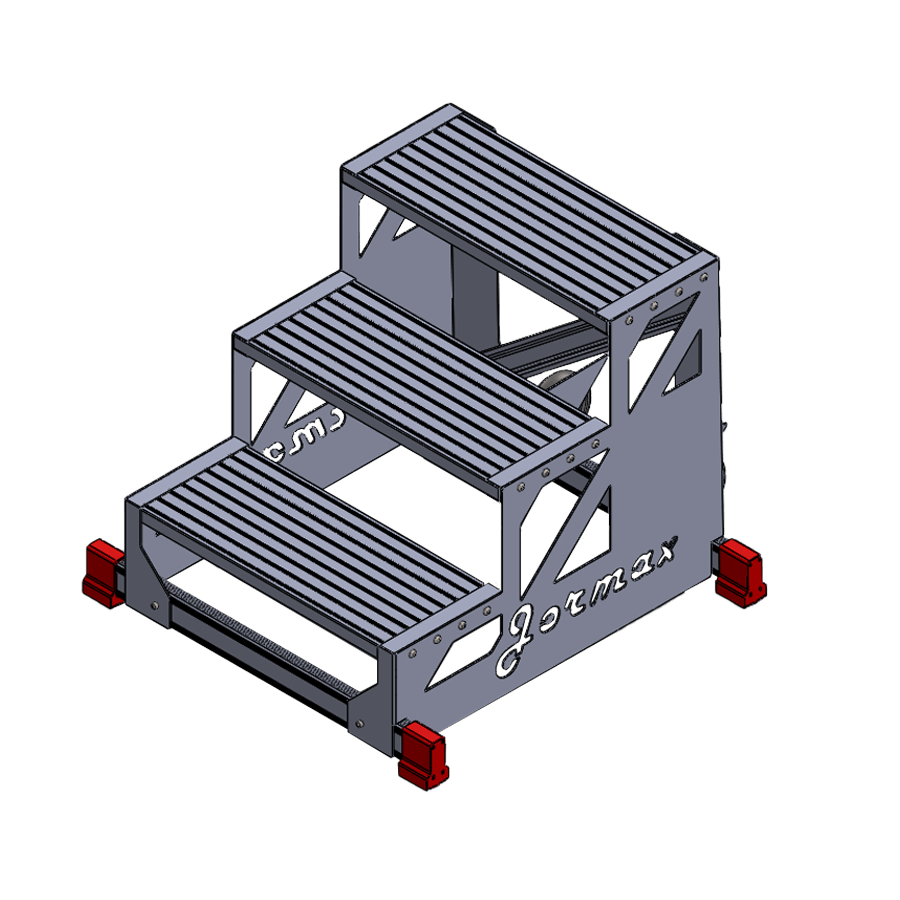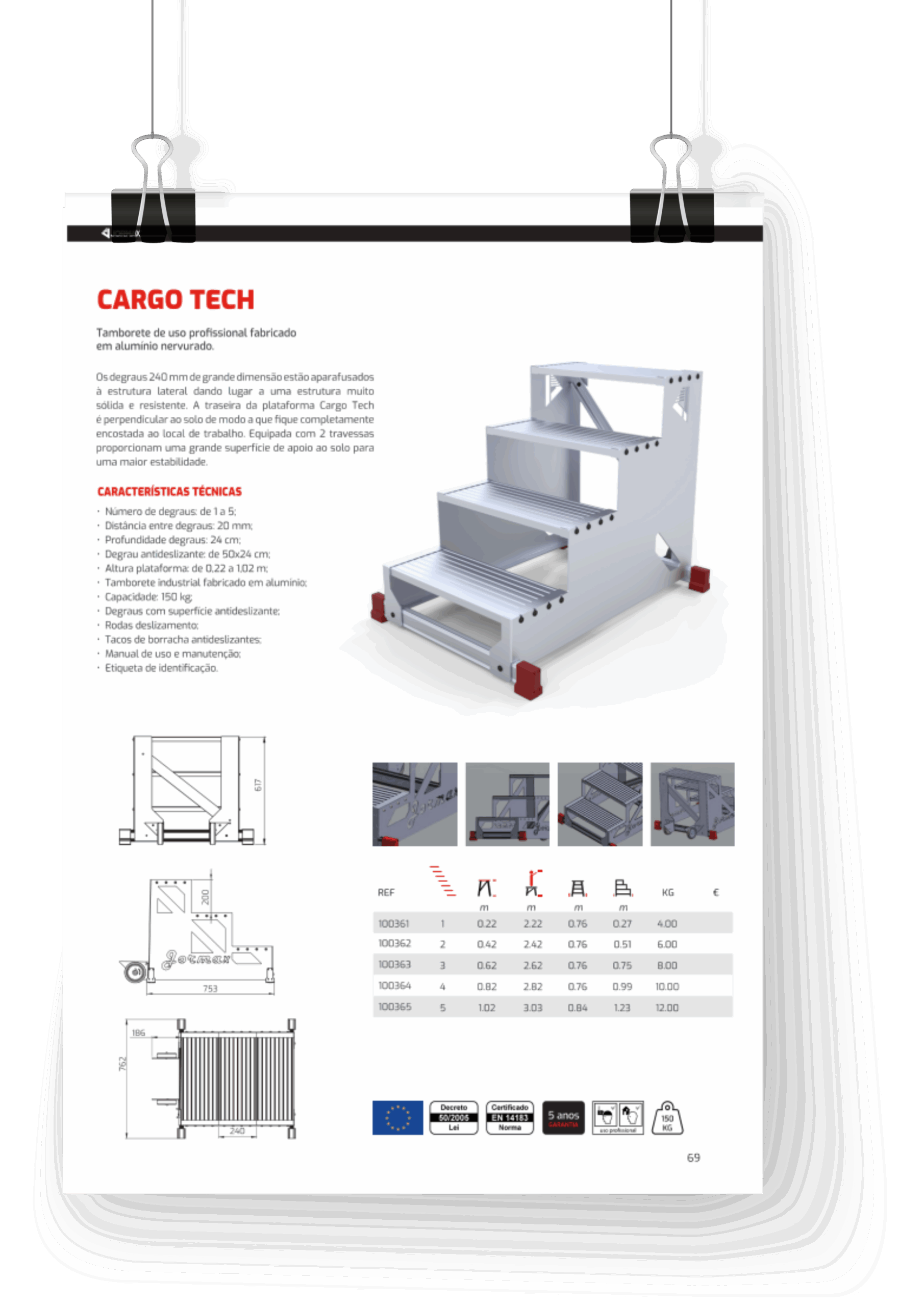 Les marches de grande dimension de 240 mm sont vissées à la structure latérale, créant ainsi une structure très solide et résistante. L’arrière de la plateforme Cargo Tech est perpendiculaire au sol de manière à être complètement appuyée contre le lieu de travail. Équipée de 2 traverses, elle offre une grande surface de support au sol pour une stabilité accrue.