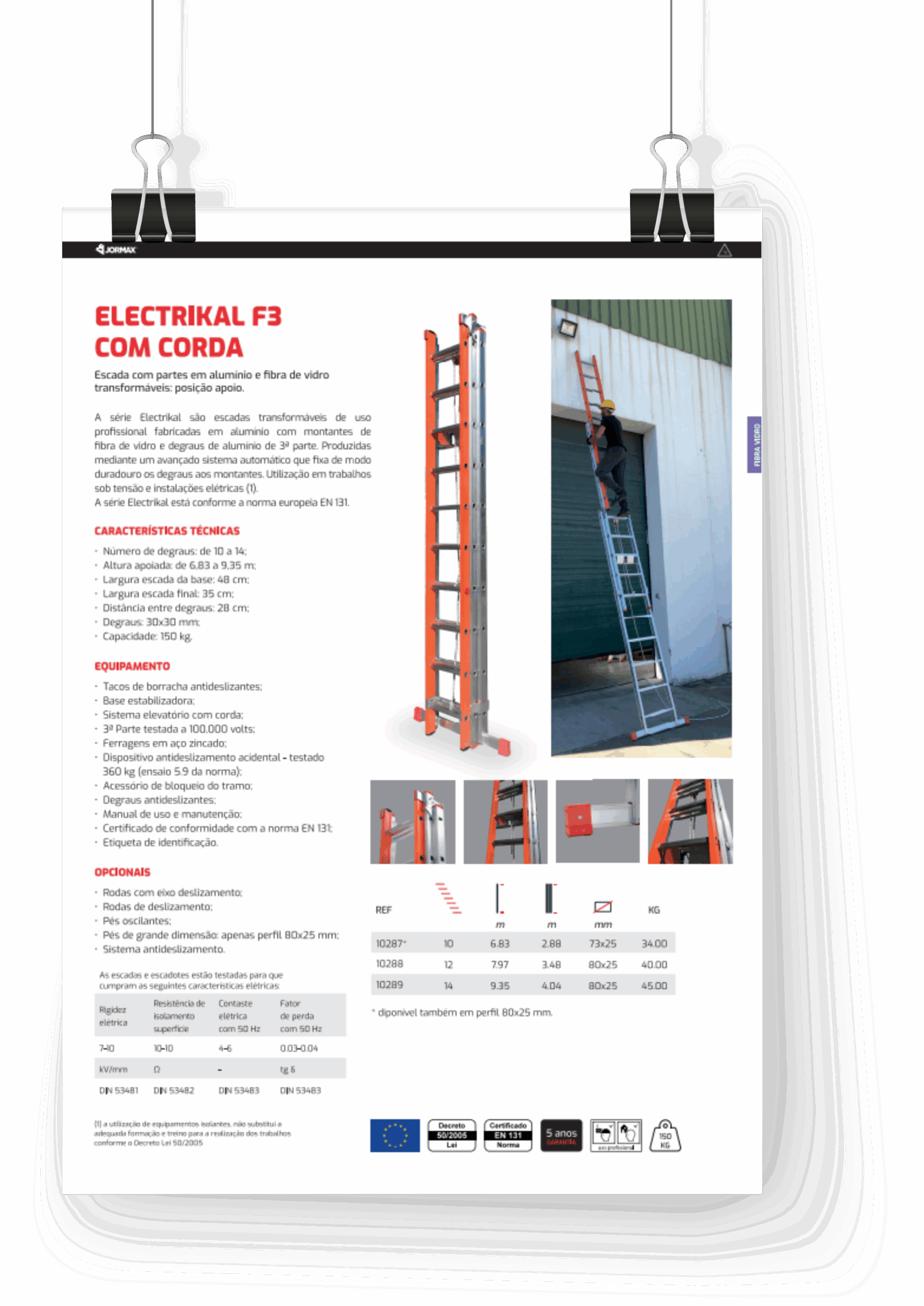 Les séries Electrikal sont des échelles transformables de conception professionnelle en aluminium avec montants verticaux en fibre de verre et marches en aluminium en 3ème partie. Produit au moyen d’un système automatique avancé qui fixe en permanence les marches aux montants. Utilisation dans les travaux sous tension et les installations électriques (1).