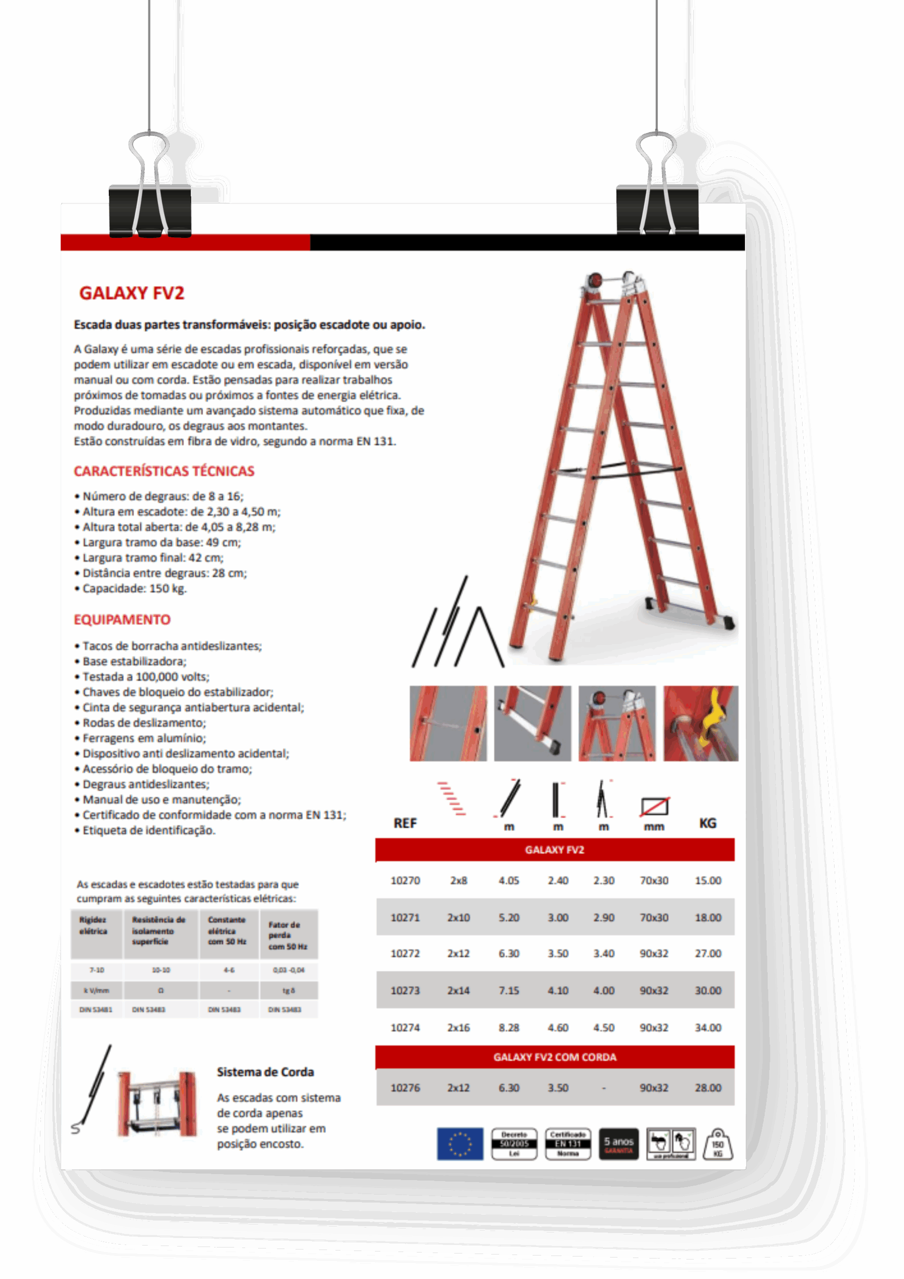 Le Galaxy est une série d’échelles professionnelles renforcées pouvant être utilisées sur une escabeau ou échelle, disponible en version manuelle ou à corde. Ils sont fabriqués en fibre de verre, conformément à la norme EN 131. Ils sont conçus pour effectuer des travaux à proximité de prises de courant ou de sources d’énergie. Produit au moyen d’un système automatique avancé qui fixe en permanence de marches aux montants.