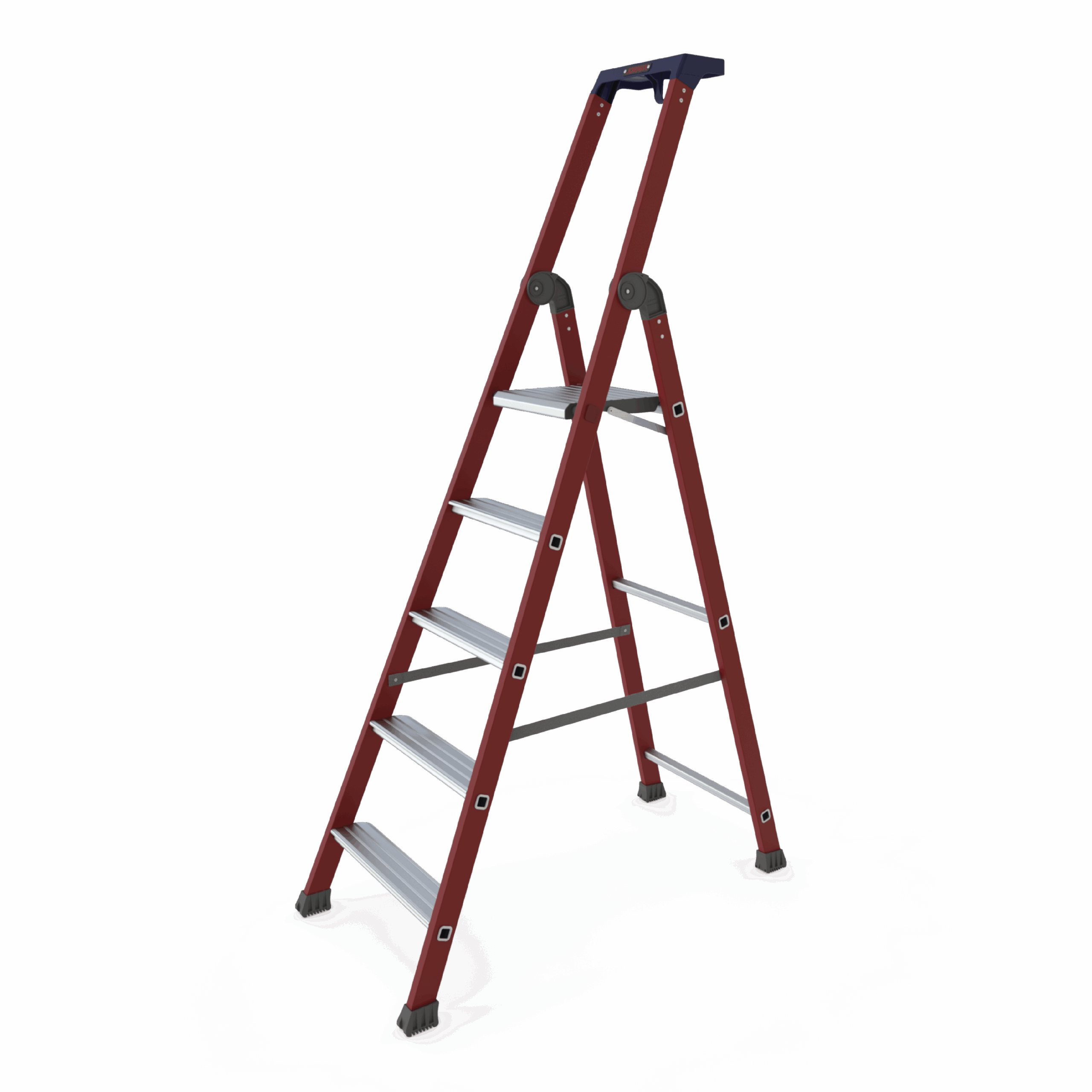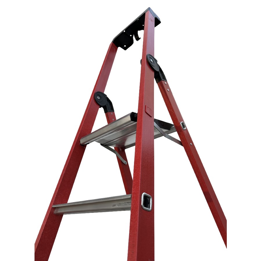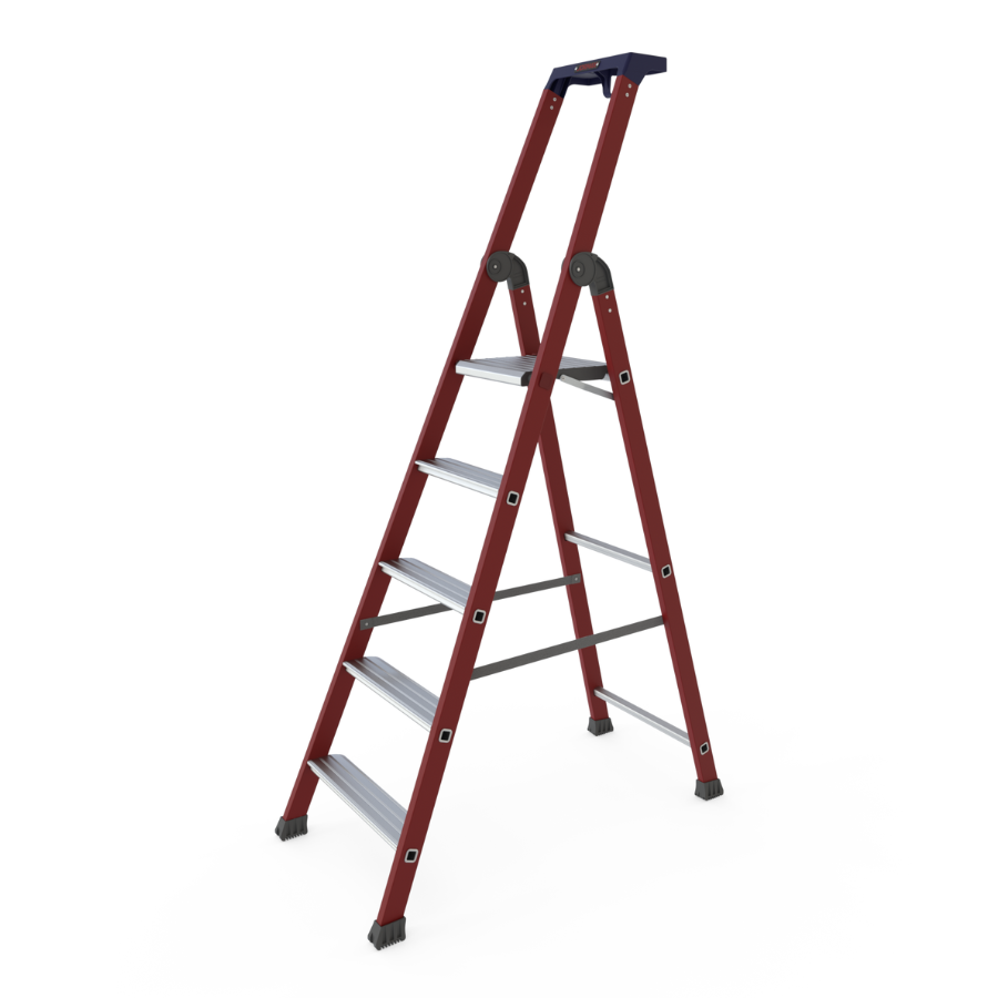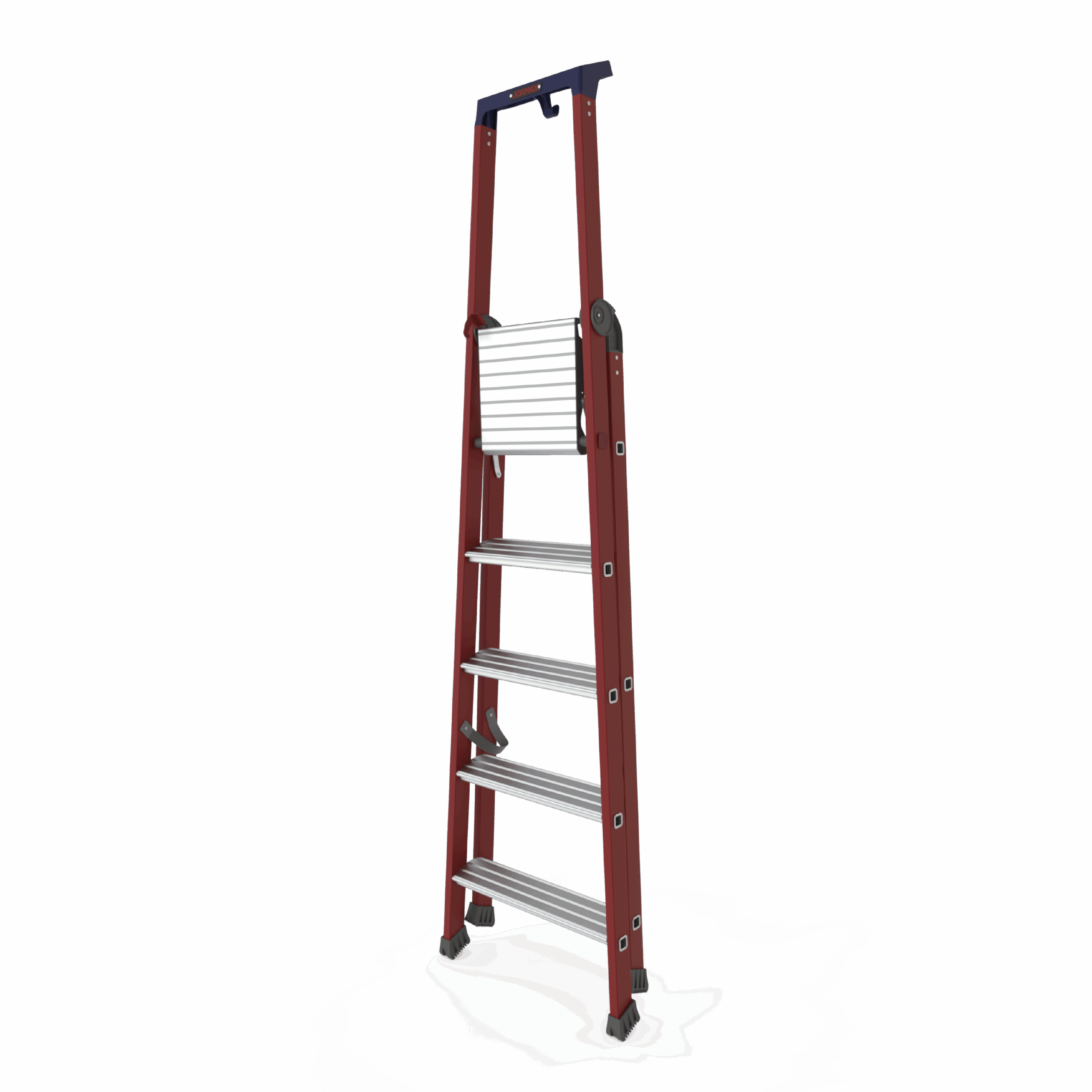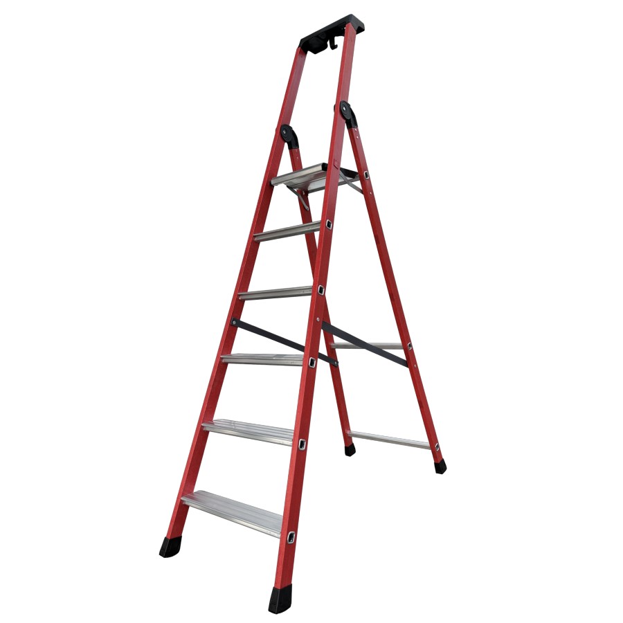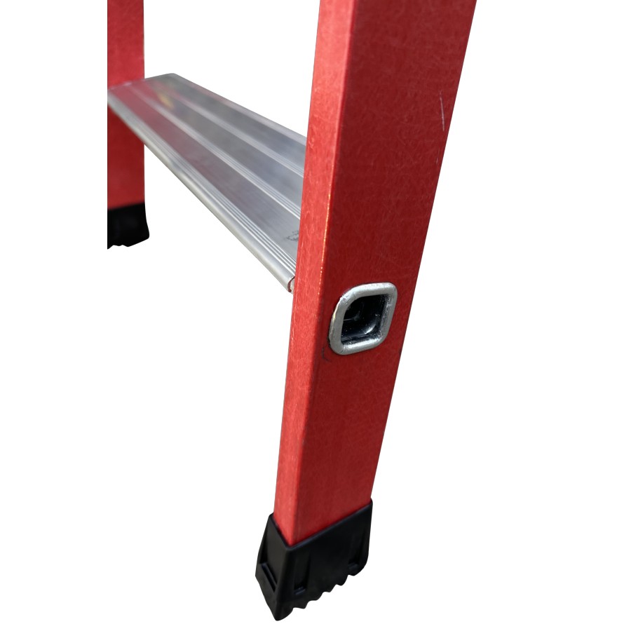 Échelle professionnelle en fibre de verre avec des marches en aluminium. Elle est recommandée pour les ouvriers qui travaillent à proximité de prises de courant, de câbles ou d’autres sources d’électricité. Elles offrent une isolation électrique et ont été testées à 5000 volts. Très pratique