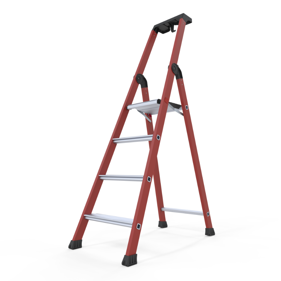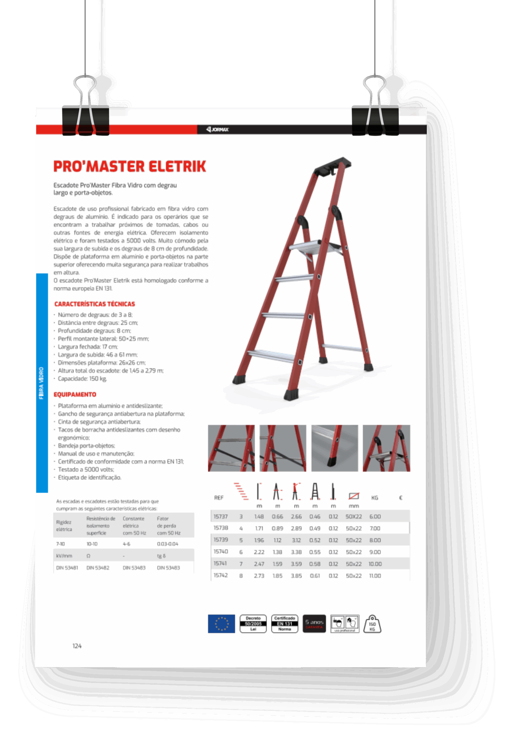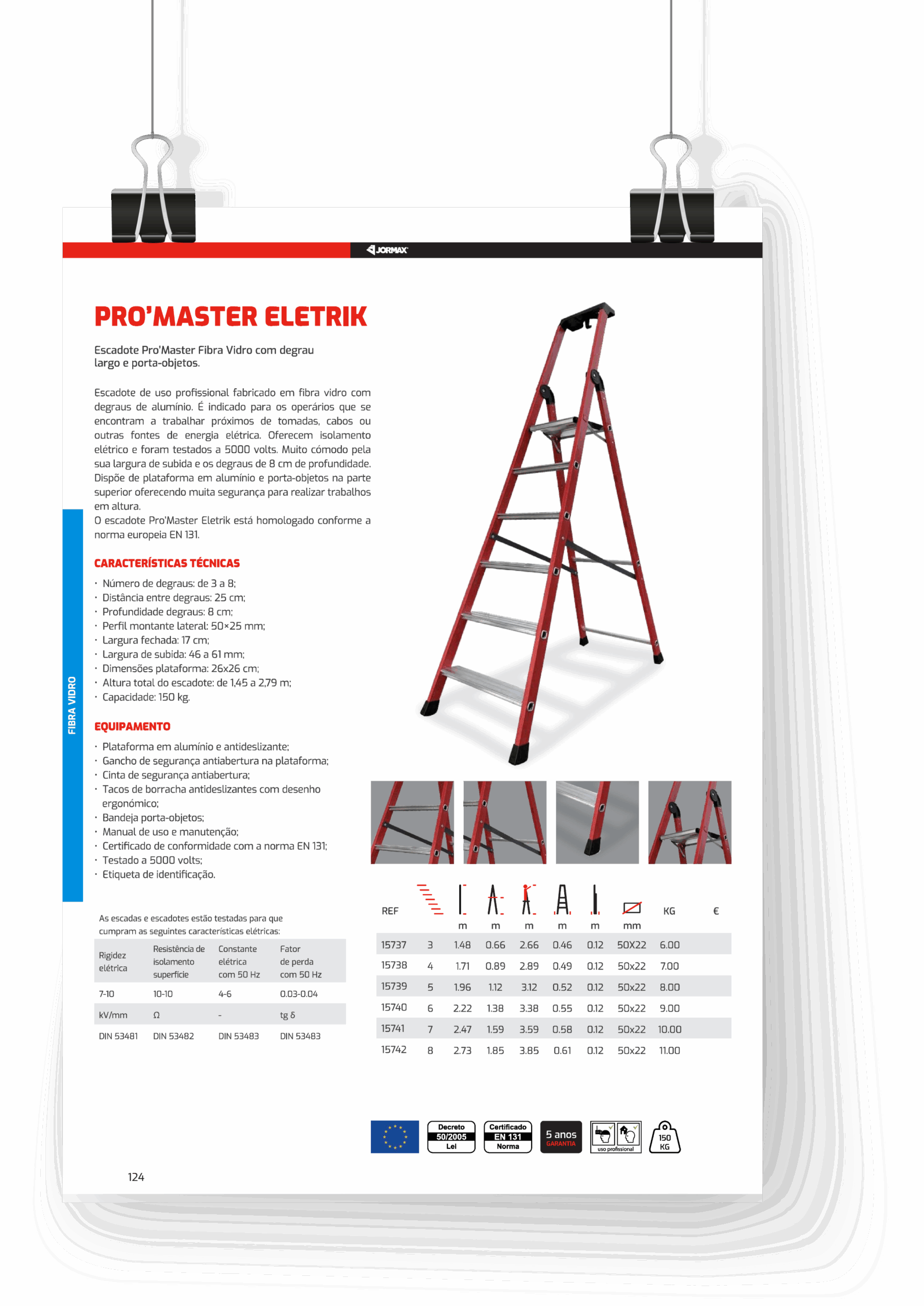 grâce à sa largeur de montée et ses marches de 8 cm de profondeur. Elle dispose d’une plateforme en aluminium et d’un porte-objets sur le dessus, offrant une grande sécurité pour les travaux en hauteur. L’escabeau Pro’Master Eletrik est homologué conformément à la norme européenne EN 131.