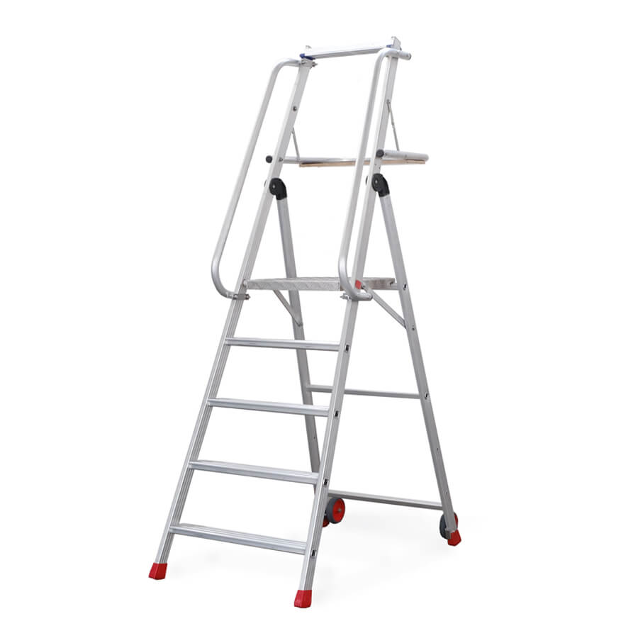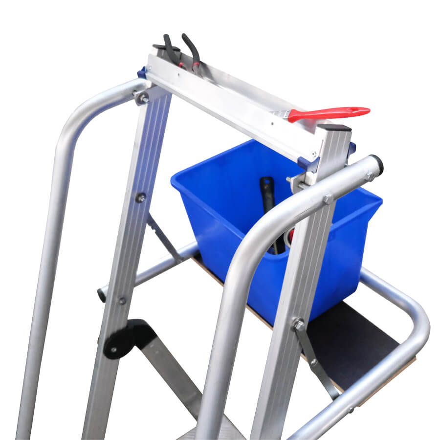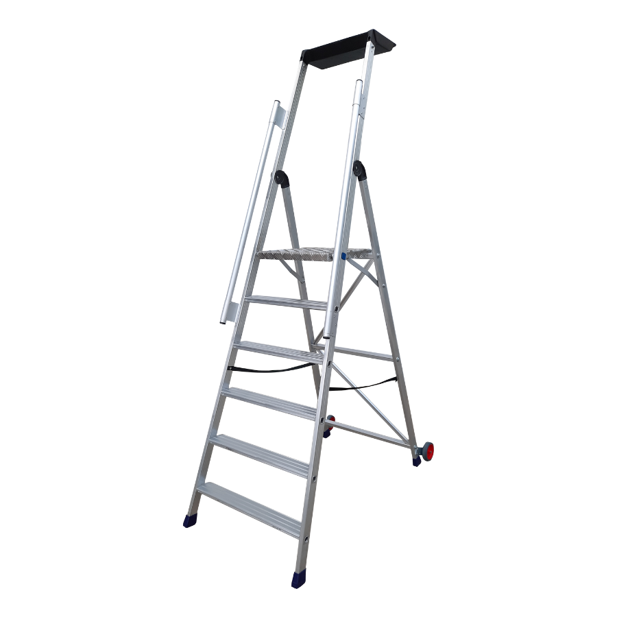 Les barreaux sont cloués aux montants, formant ainsi une structure très solide. Très confortable grâce à sa largeur de montée et à ses échelons de 8,50 cm de profondeur. Il dispose d’un plateau et d’un porte-outil en haut, d’une large plateforme et de garde-corps qui offrent une grande sécurité lors des travaux en hauteur.
