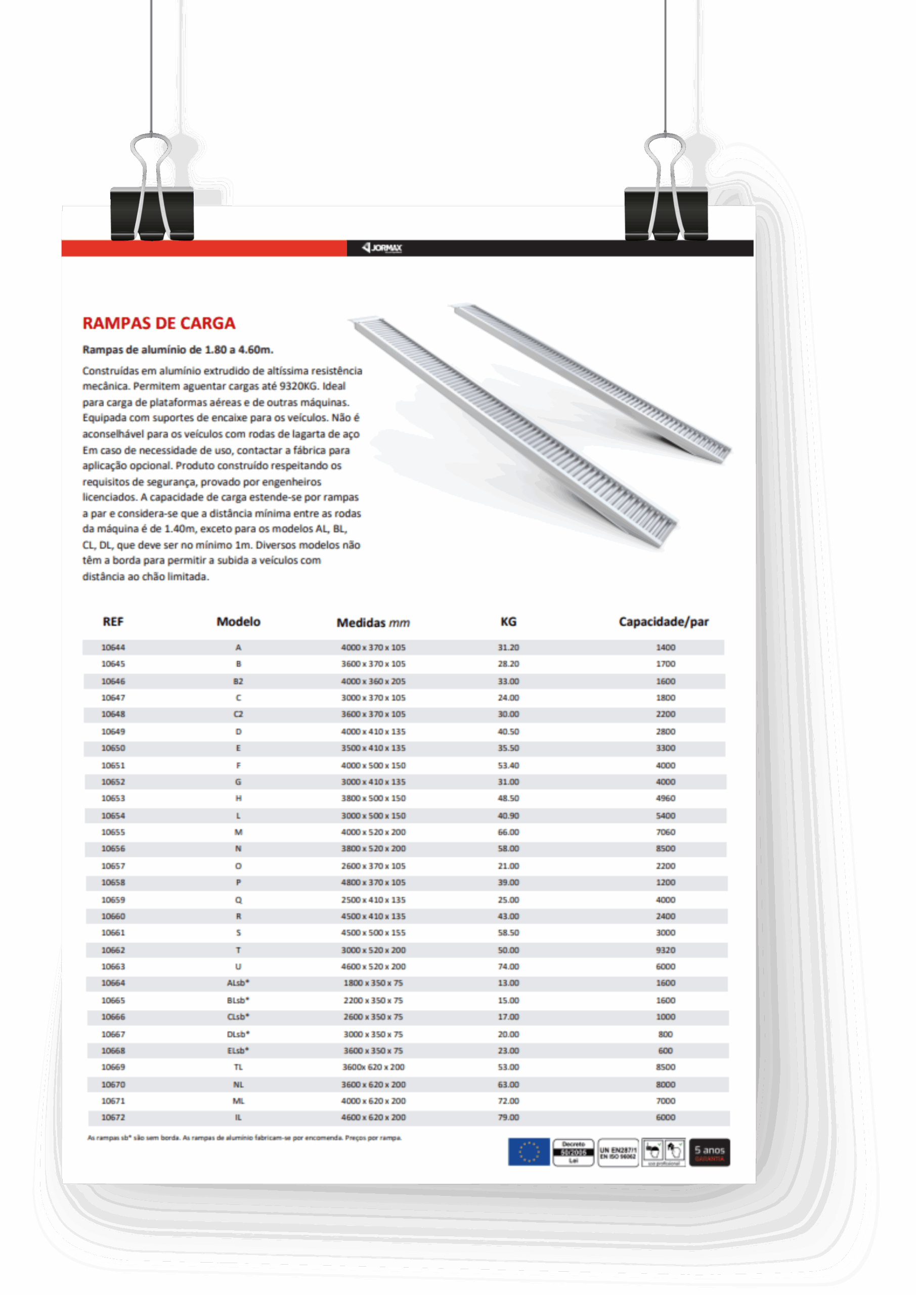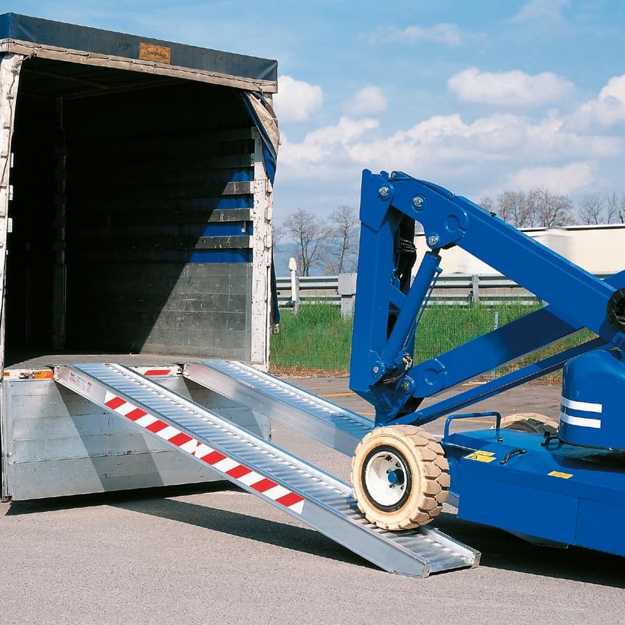 Construit en aluminium extrudé de très haute résistance mécanique. Ils peuvent transporter des charges allant jusqu’à 9320 kg. Idéal pour le chargement des plateformes aériennes et autres machines. Équipé de supports d’amarrage pour les véhicules. Il n’est pas conseillé pour les véhicules équipés de roues à chenilles en acier. En cas de besoin d’utilisation, contactez l’usine pour une application optionnelle. Produit construit conformément aux exigences de sécurité, prouvé par des ingénieurs agréés. La capacité de charge est par rampe au pair et la distance minimale entre les roues de la machine est de 1,40 m, sauf pour les modèles AL, BL, CL, DL qui doivent faire au moins 1 m. Plusieurs modèles n’ont pas le bord pour permettre l’ascension aux véhicules avec une distance limitée au sol.