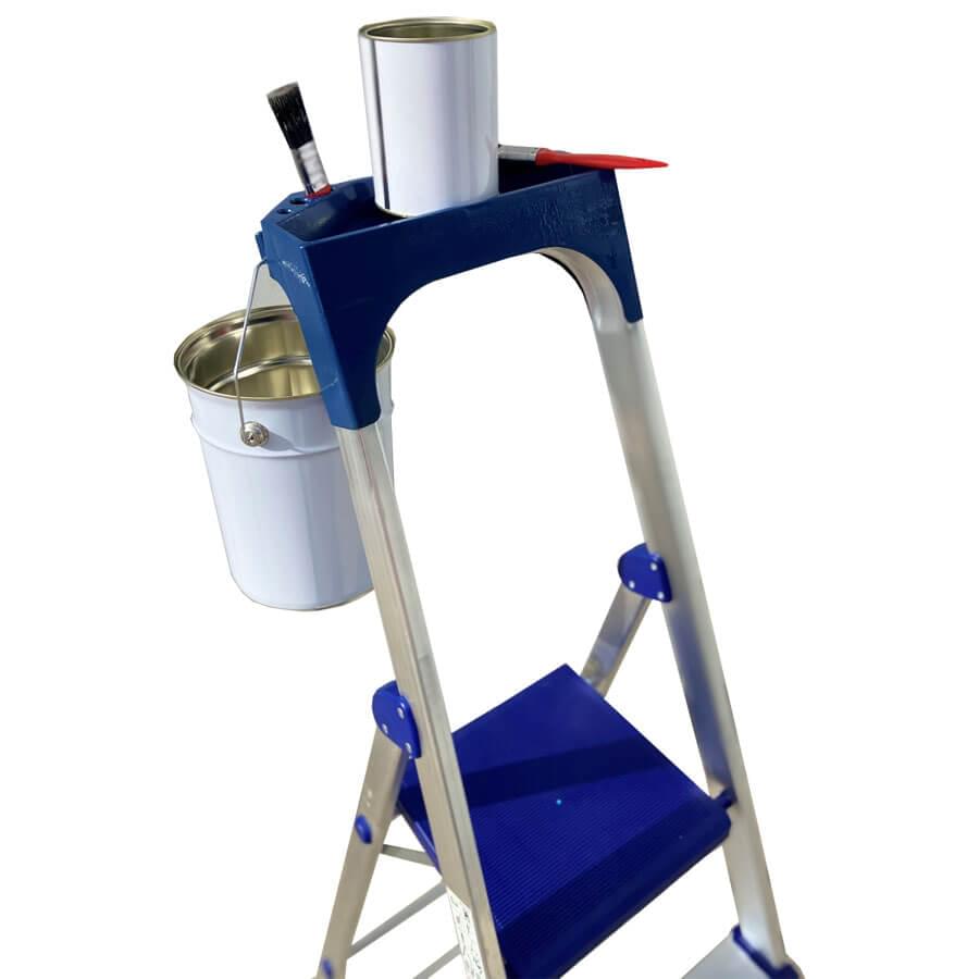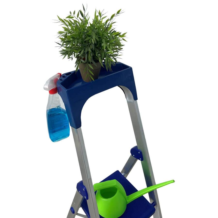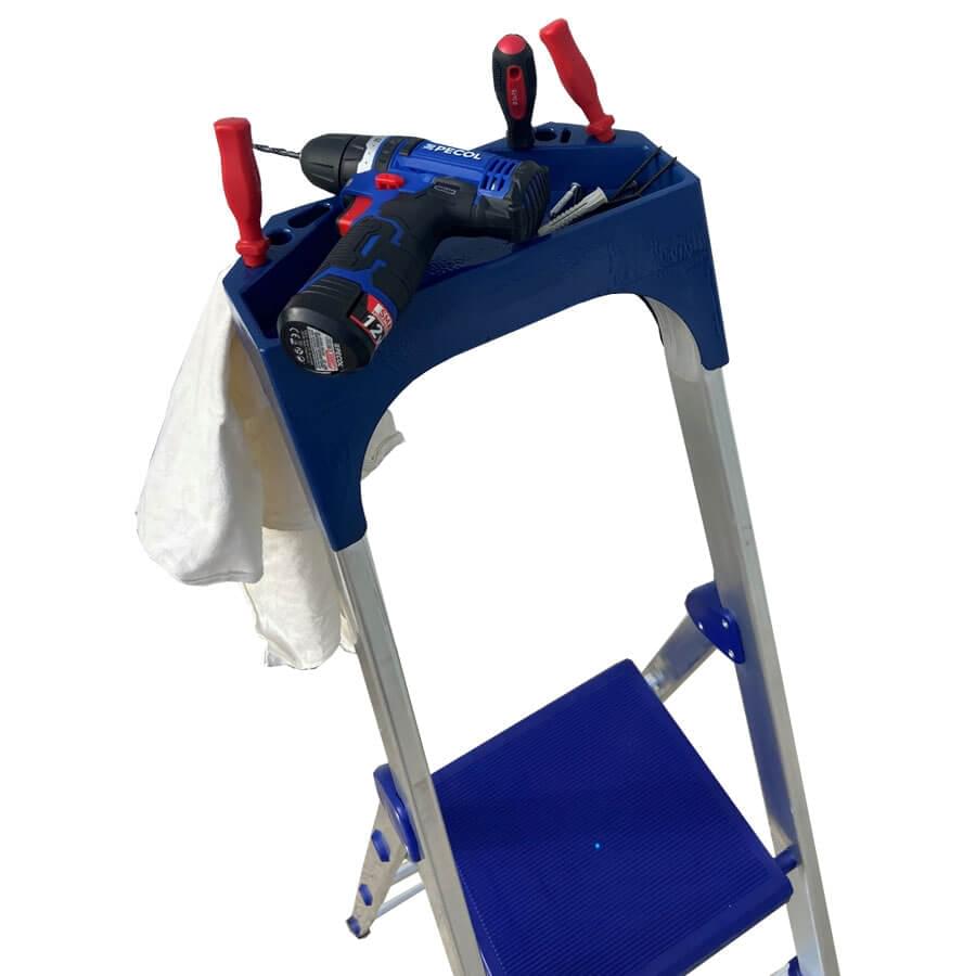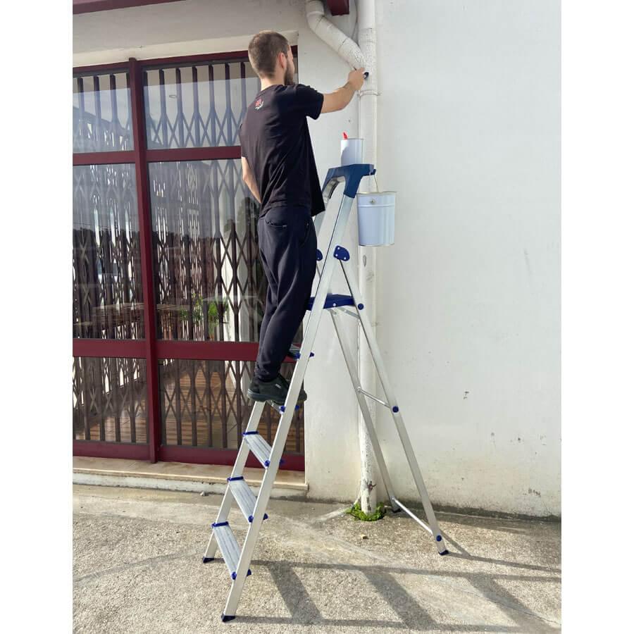 Échelle en aluminium de résistance maximale. Les marches de 120 mm sont revues en amont, constituant une structure très résistante. Très confortable selon la largeur de montée, l’échelle est équipée d’un large porte-objet d’une utilité innombrable.