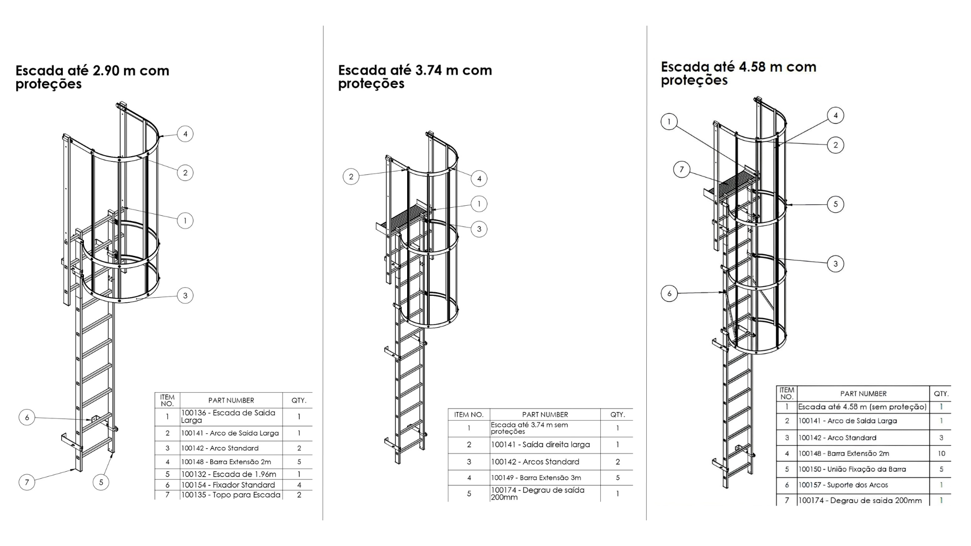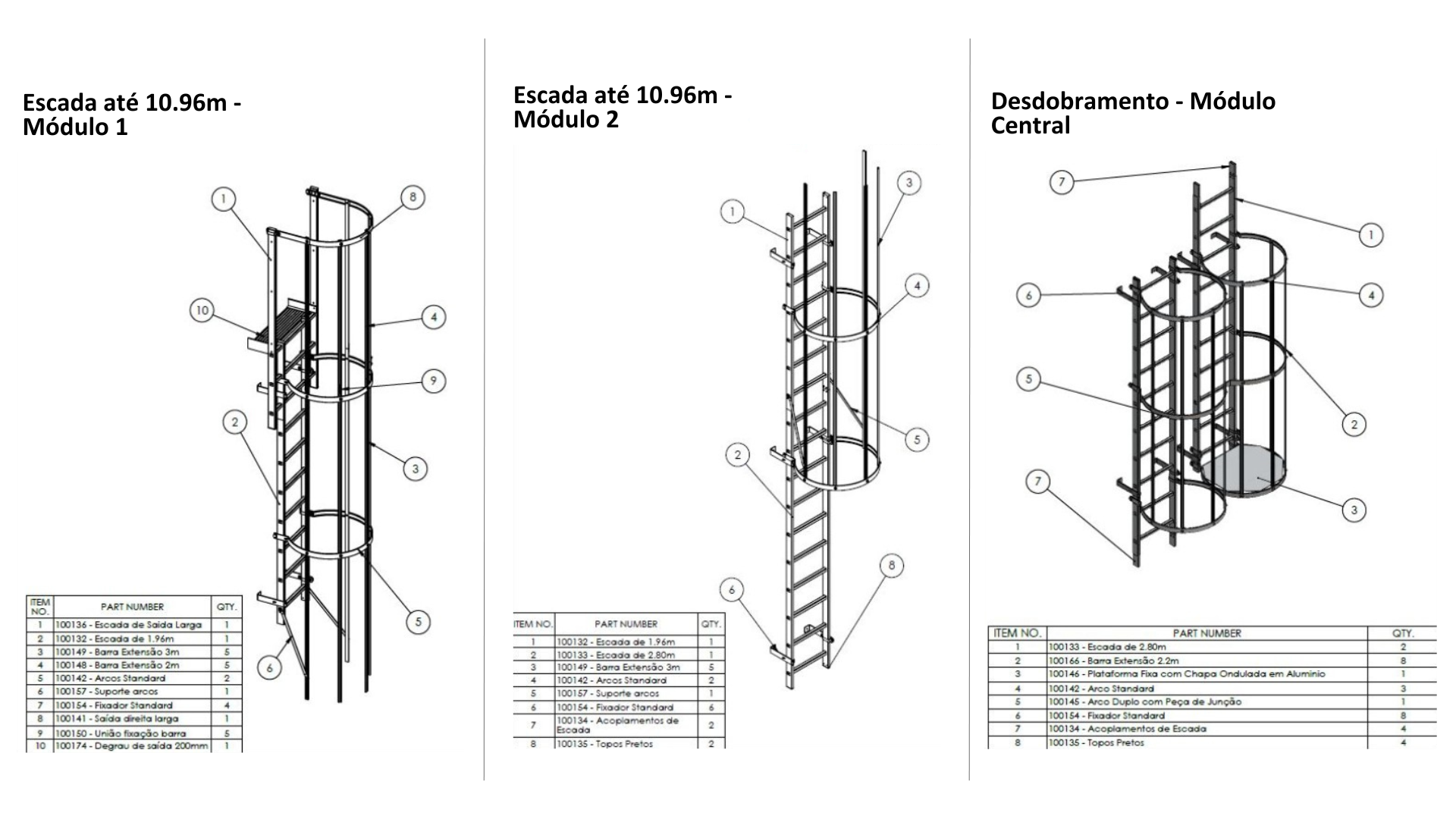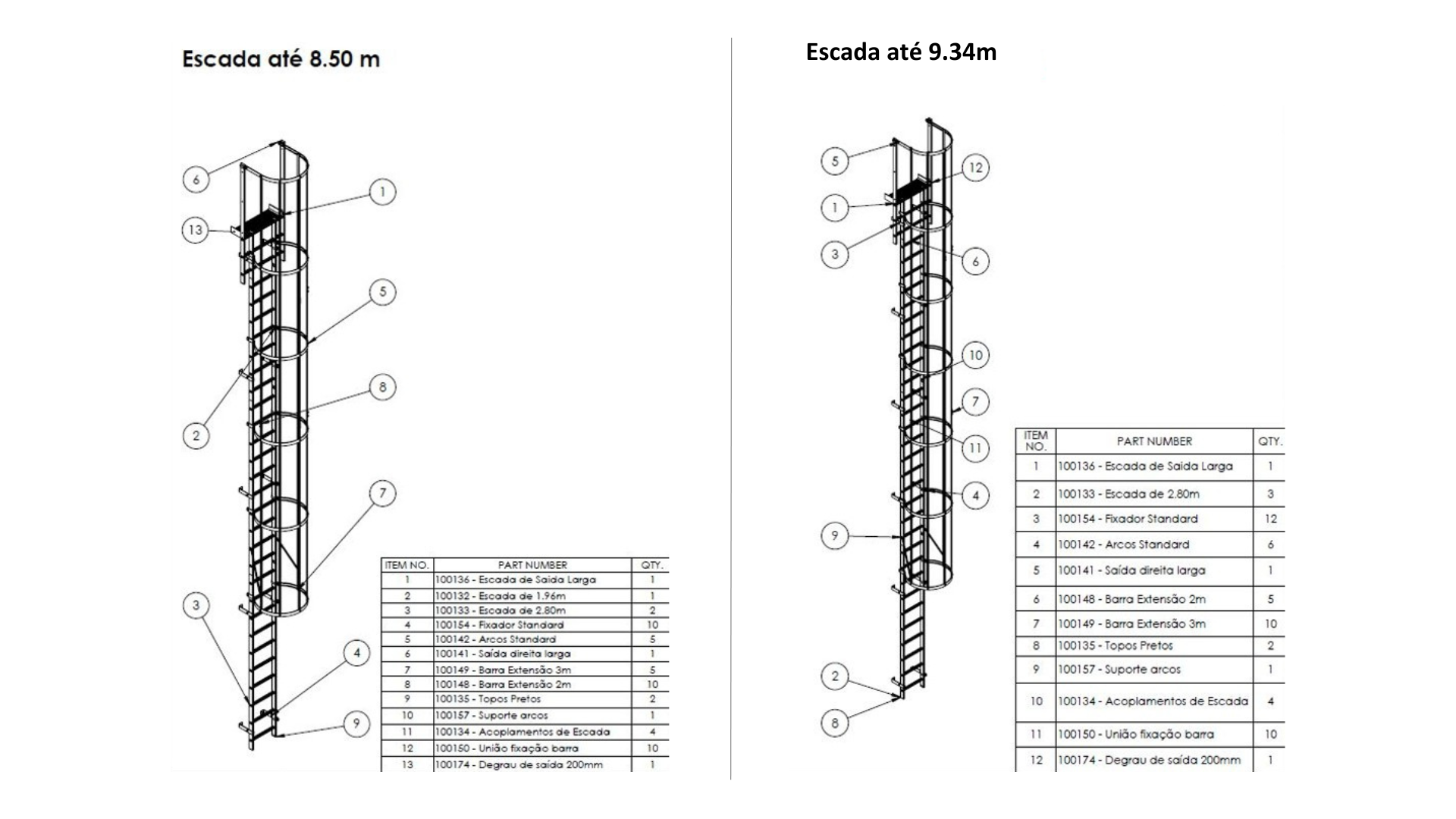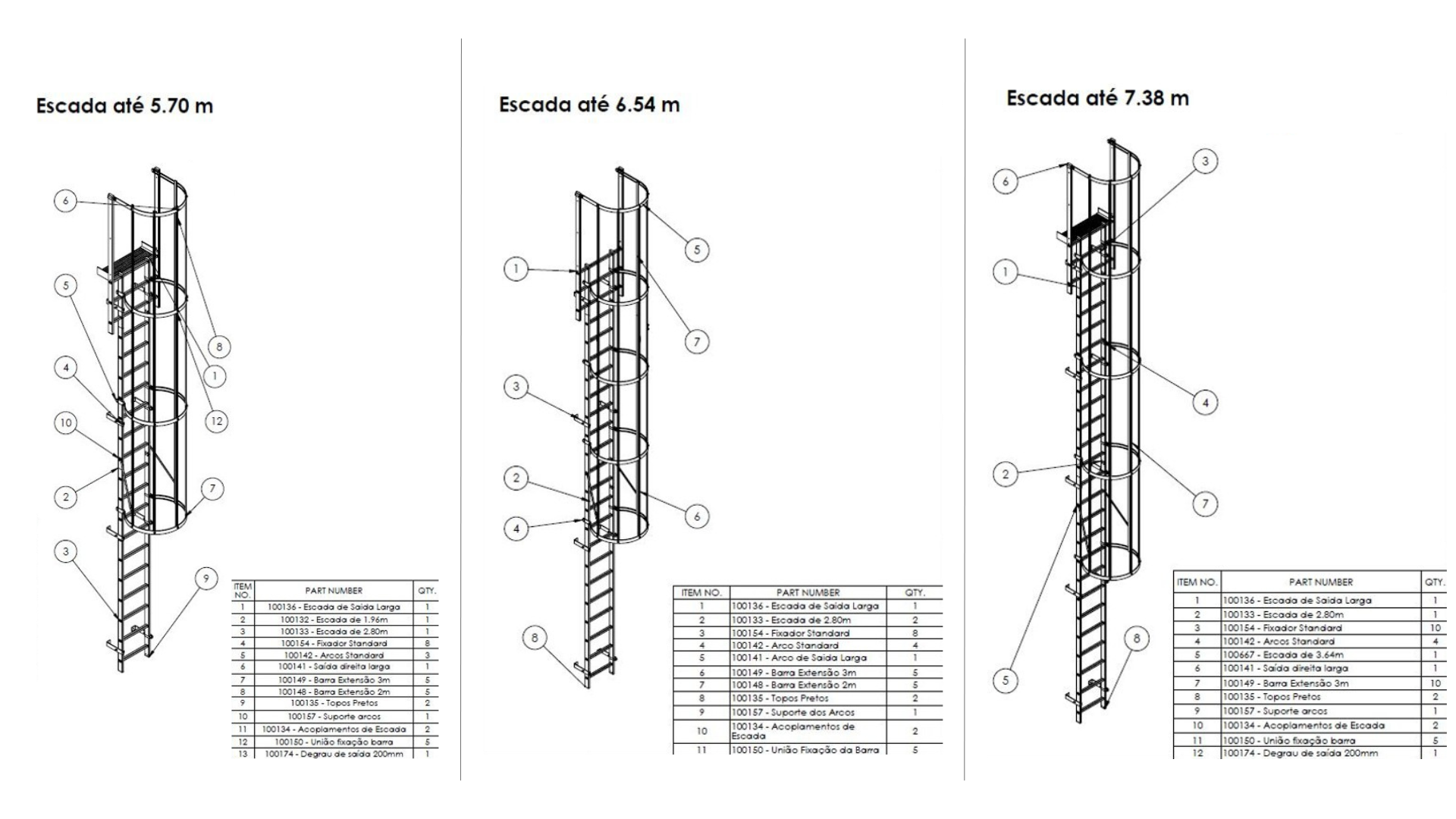 Altura do Edifício Nº de Escadas Nº de Escadas Nº de Escadas Nº de Escadas Desdobramento Módulo Desdobramento* Quantidade de Fixadores Quantidade de Arcos de Proteção Quantidade de Arcos de Proteção REF VIDEOS